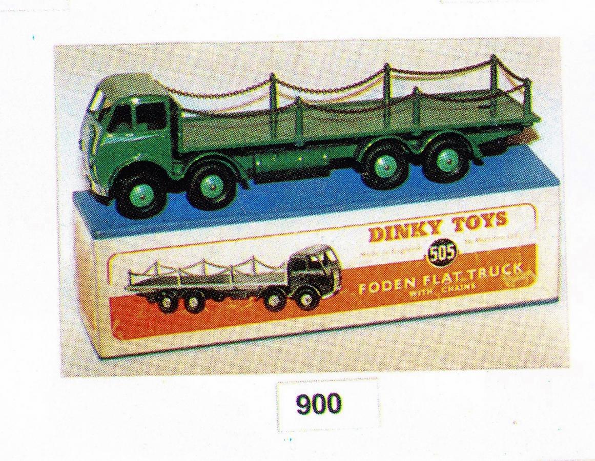was advertised already in the Dutch and US catalogues in 1951 (ill. 9). I cannot confirm this for the UK 1951catalogue because I havent got one and no one has uploaded a copy to the website documents area yet. The UK catalogue of May 1952 already shows the second type chain lorry (in colour, green), as do the Dutch and USA catalogues (ill. 10), in black and white. The hubs for the first type chain lorries were always ridged, the second type were always grooved Supertoys hubs. The UK catalogue of May 1952, however, shows the second type with ridged hubs (ill. 11). As far as Im aware the cast in Dinky Supertoys name, underneath, survived for all issues. The early boxes for 505 (50505), with orange/black printed label pasted on the blue box lid, both first and second type, only show the brand name Dinky Toys (1952, the year of introduction, was exactly the year that the Dinky Supertoys name was dropped from the boxes). In 1954 the blue striped boxes were introduced with the new number 905 but still with the Dinky Toys name only. This became Dinky Supertoys in straight up letters end 1955/early 1956 (ill. 12). Whatever the contents, the illustration shows the green one only, a colour roundel sticker indicating the contents colour. About 1954, besides being renumbered 905, the previously all maroon version had its wheels painted red (ill. 13), giving this rather gloomy finished model a brighter appearance (the same goes for the other maroon models, for instance the British Railways vehicles Hindle Smart Electric Lorry and the Horse Box, the Luxury Coach etc., ill. 14). The green one, with its slightly lighter green wheel hubs, remained unchanged. The black round treaded tyres, were replaced by blocked ones. Most but not all examples of the chain lorry show the 20 roundel on the left rear mudguard. This did not show up anymore on the later red/grey issue, because its introduction coincided with the deletion of that sign (ill. 15). Memo 20645, Amended Colour Schemes of 7 February 1957, testifies to the discontinuation of the maroon and green issues, in favour of the new duo tone finish in place of present two colour schemes(ill. 16, 17). A rivet replaced the screw at the rear (ill. 17), so swapping of cabin/chassis and loading platform producing rare fakes became virtually impossible (ill. 18). The blue striped box was adapted with the correct illustration and the new contemporary italic lettering of the brand name. An unusual and rare exception is the blue/grey finish (ill. 19, Vectis Auctions). The red/grey issue was discontinued in 1964, being the last of the famous Foden series models to leave the Dinky Toys range, even fitted with red plastic hubs in the end (ill. 20). Examples with windows, as suggested by the 1963 catalogue illustration, are not known (ill. 21). As always, corrections and additions welcome! Kind regards, Jan Some useful articles: Graham Bridges, First series Foden trucks 1947-1952. In: Classic Toys 1/1 (Aug/Sept 1994). Graham Bridges & Stewart Orr, Second series Foden Trucks part 2. In: Classic Toys 1/3 (Jan/Feb 1995). Clive Unsworth, Dinky Toys 1st series Fodens Part 1. In: Model Collector 29/12 (Dec 2014). Clive Unsworth, Dinky Toys 2nd series Fodens Part 2. In: Model Collector 29/13 (Christmas 2014).