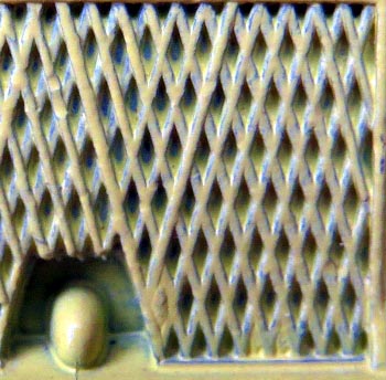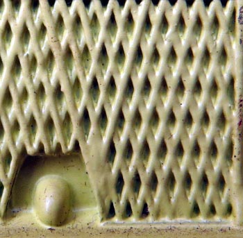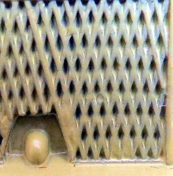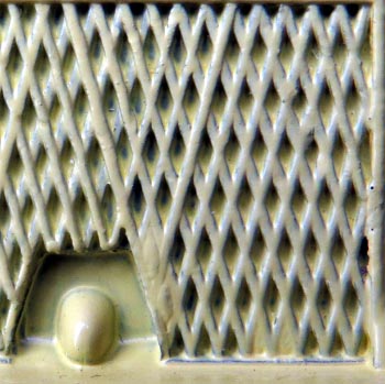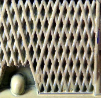 The model on the left is in a blue-striped box, no inspection date decipherable (one with three rows of numerals) but with a green spot, which dates it from about 1962. The fact that a large percentage of the grille is 'filled in' may have been due to an excessive paint being the culprit, rather than a dramatic change in the mould. On the right is the grille of a model packaged in a yellow half pictorial scene lidded box issued after the blue striped boxes had been deleted.