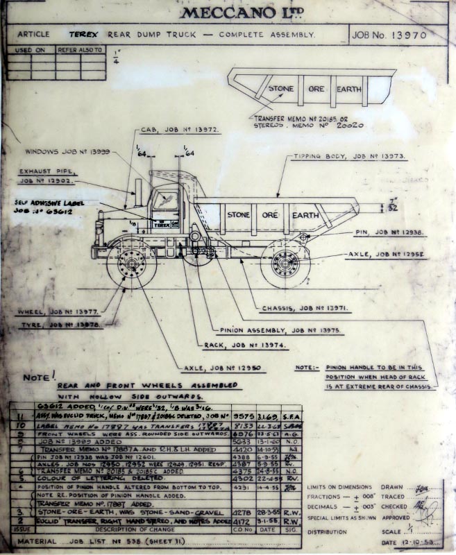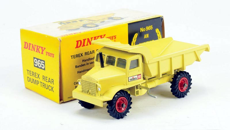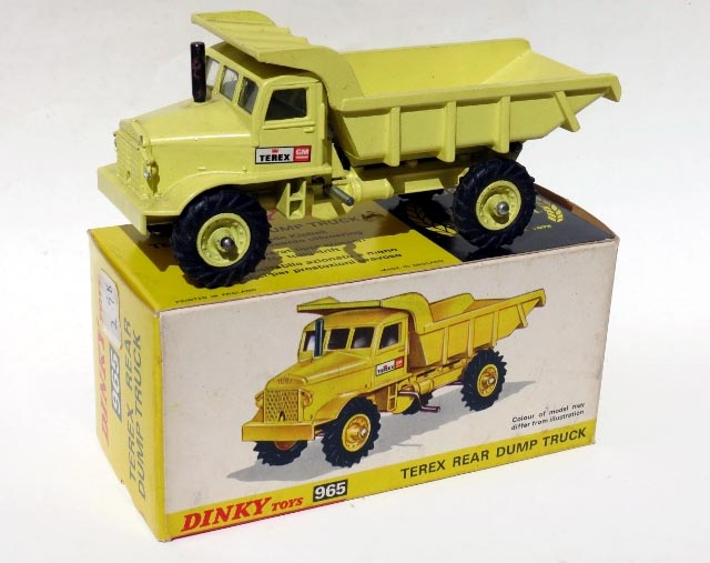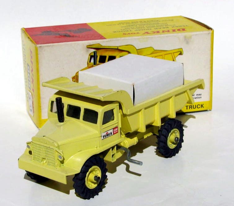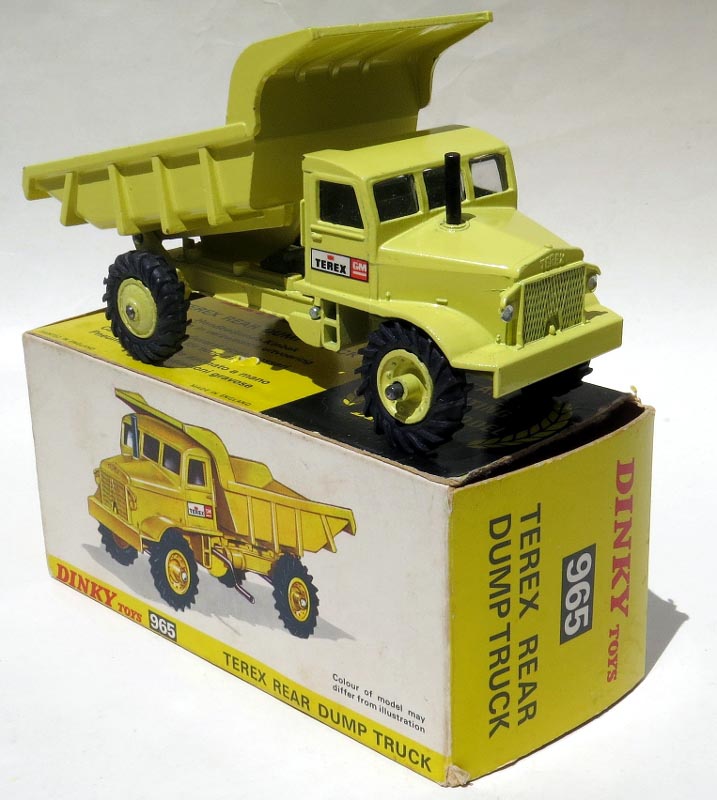 Greetings allOne may wonder why this Thread is not included within the existing 965 Euclid Rear Dump Truck Thread. Well the answer is rather simple. Based on matters such as the change of name and changes to the actual die, the downgrading to just a plain Dinky Toys, the different cast of characters, the United States Justice Department, a little fellow called White and a Caterpillar, the 965 Terex Rear Dump Truck deserves its own Thread.The following has been included in the 965 Euclid Rear Dump Truck Thread, but it is briefly mentioned here again to give perspective to the story of the Dinky Toys 965 Terex Rear Dump Truck. The expanded version can be read in the 965 Euclid Rear Dump Truck thread.The company that became Euclid was founded in 1907 in Wickliffe, Ohio, by George A. Armington as Armington Electric Hoist. It was renamed Euclid Crane & Hoist when the plant was relocated to Euclid, Ohio. Euclid built experimental tractors, one crawler and several wheeled, in the 1920s, and entered the construction equipment industry in 1924 resulting in the establishment of the Road Machinery Division in 1926, and incorporated as Euclid Road Machinery, a subsidiary of the Euclid Armington Corp., on July 11, 1931. Euclid Road Machinery became independent of Euclid Armington on January 1, 1933. Euclid Road Machinery introduced a variety of allied equipment for crawler tractors, but its biggest breakthrough came with development of the first true off-highway end dump and bottom dump trucks in the mid 1930s. Euclid came to dominate the market with these vehicles to the point that Euc came to be used generically for them. Euclid expanded with overseas branches and began production of trucks and scrapers in Motherwell, outside Glasgow, Scotland in 1950 and in 1951 appointed Blackwood Hodge in Northampton in Northamptonshire a previous importer of agricultural and mining machinery as their sales agent and distributor. General Motors, which had been exploring entry into the heavy construction equipment market, acquired Euclid Road Machinery on September 30, 1953, and made it a division of GM on January 1, 1954, which included the Euclid production facility in Scotland. Meanwhile, the design of the Dinky Toys 965 Euclid Rear Dump Truck proceeded accordingly at Meccano following a visit to Blackwood Hodge. The initial drawing was completed on 12 October 1953 and during 1954 at least three changes to the design was made with more changes to the design during 1955. When it came to deciding on the colour of the model, and although Euclid painted their vehicles in a dark shade of green that later became known within the industry in the UK as Parkinson Green which was also the corporate colours for Sir Lindsay Parkinson & Company Ltd that utilised Euclid machinery extensively, Meccano selected pale yellow as used by a competitor to Parkinson, Laing Constructions. Then came the anticipated launch of this fine model, with the announcement in the October 1955 issue of The Meccano Magazine. Over the years a number of changes were made to the model while it was in production, as well as changes to the models packaging. This was followed by the dropping of the trade mark Supertoys on the end-flap box style, having a full picture on two sides with the title Dinky Toys although no changes were made to the casting on the chassis to show the model was now just a Dinky Toys. Finally, on 3 January 1969, the drawing plans were amended when the name of the model was changed to Terex. Thus the 965 Euclid Rear Dump Truck ceased to exist but was re-invented under a new name.THE CREATION OF TEREX ORGOODBYE