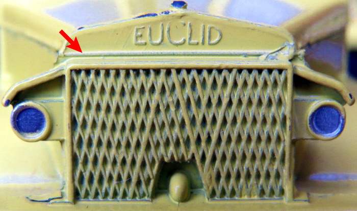 Hello Bruce, For me, it is obvious that the radiator, front bumper and front of the headlights of the Terex is a new casting. The raised line shown by the red arrow has been deleted for the Terex and to do this, the tool makers would have had to add metal in the die by welding. This is NEVER done as applying such heat to the die would distort it. Also the word Euclid could have been deleted in the same way but again this is never done. An other way to delete a marking is to erase it with a milling machine but this leaves a raised cartouche as can be seen on many models the marque of which has been changes from Supertoys to Dinky Toys or their reference number deleted. A die is made of at least four pieces : inside of the body, top, front and rear. Some times of six parts with left and right sides. In the case of the Euclid / Terex model, the part of the die for the front of the model has been replaced by a completely new one. The same was done to change the Triumph Herald into the Vitesse, new die front piece. The piece for the front of the Triumph Vitesse has probably been lost when the tools were transfered to India, this is probably the reason why the Vitesse was never made as a Nicky Toys.