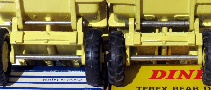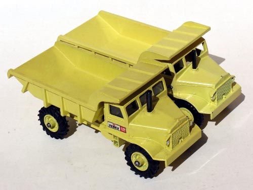 On the left also packaged in a yellow pictorial lidded box, but with no transfers on the tipper unit. The model on the right was packaged in an end-flap pictorial box