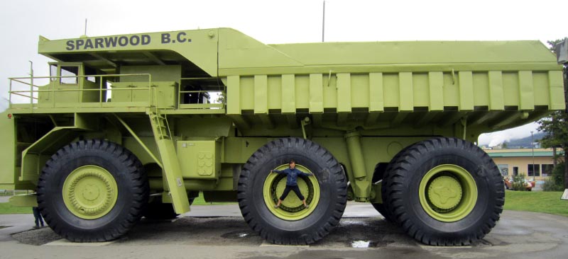 I end this treatise with a photograph of a group of proud Terex employees providing the symbol of their company and two images of the Terex Titan, the truck that was the worlds largest in carrying capacity for 25 years between 1973 and 1998, although in size, the Titan still remains the worlds largest. It is now preserved in Sparwood, British Columbia, minus its engines. The tyres are filled with concrete as the Chamber of Commerce grew tired of continually pumping air into them. To put the Titan in perspective, the truck could carry the load equivalent of 23 Euclid R-15 Rear Dump Trucks!