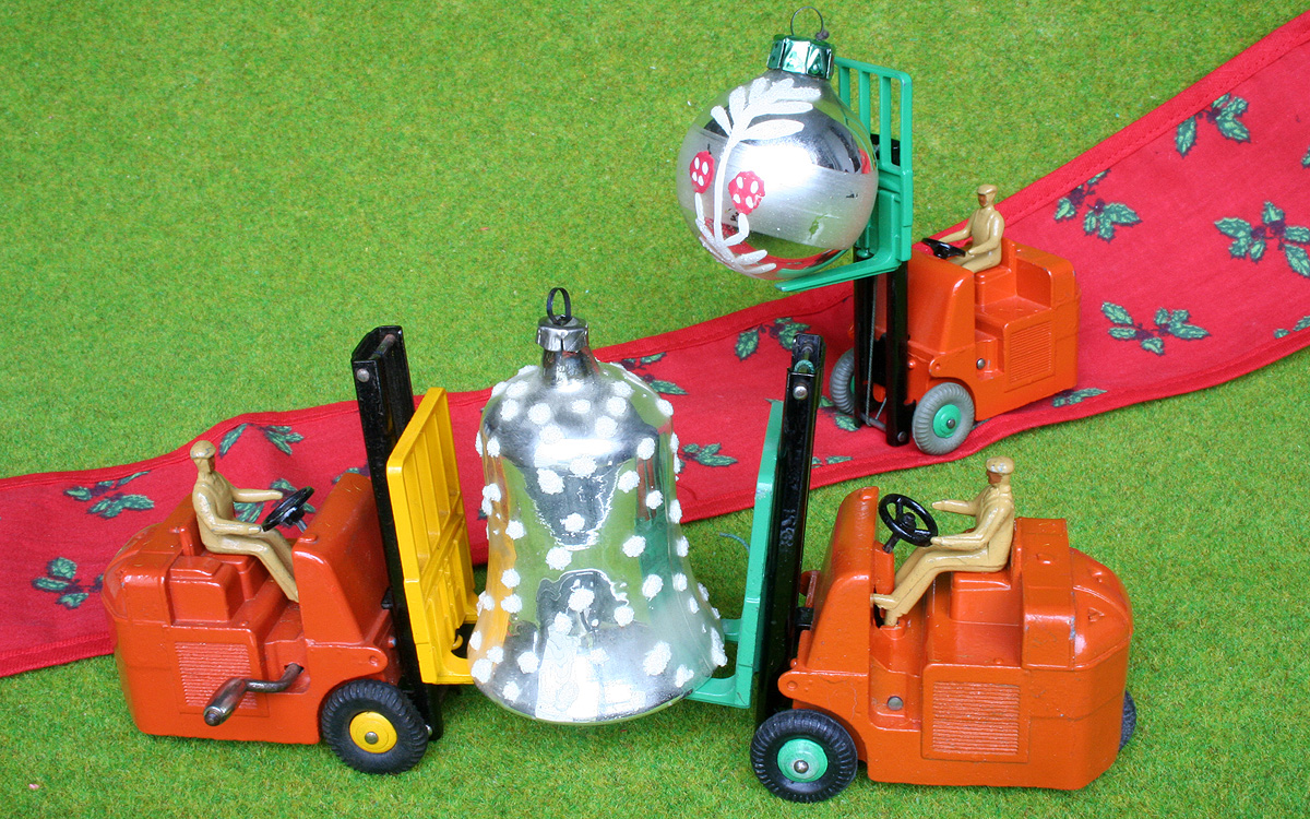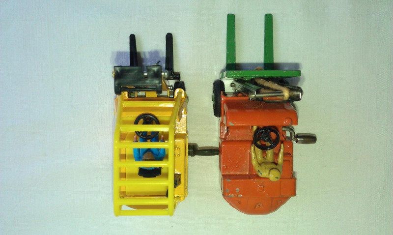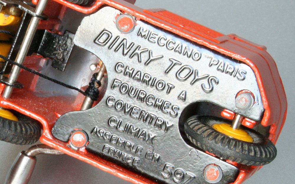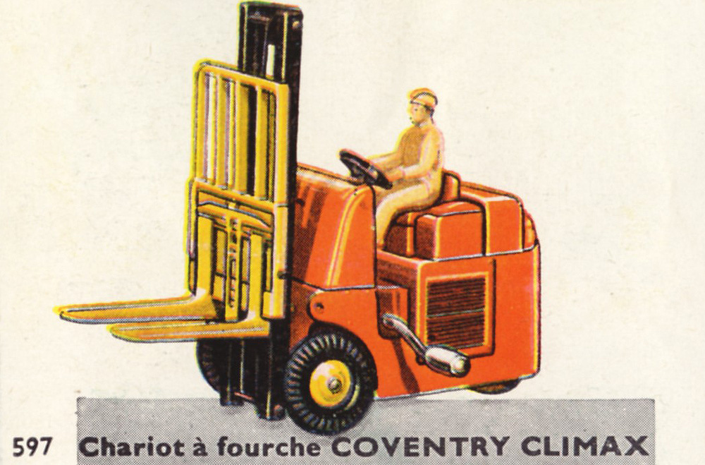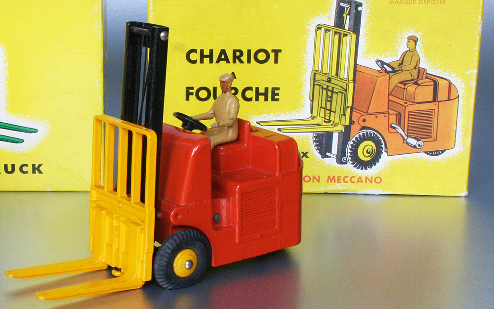 A nice summing up, Jan, thanks. An intriguing model of which I have some (box)variants too, but still a lot to go ... I have mentioned before that the both the French assembled model and its box and official French illustrations show some remarkable inconsistencies as the name and the representations of the model are concerned. Firstly, the French pictures are all mirrored, showing the handle and the box next to the driver's seat on the left side of the model. This goes both for the French box for the early import version and the one for the later French assembled issue. But for the catalogue pictures as well. Secondly, the base of the French assembled Fork Lift Truck reads clearly CHARIOT A FOURCHES (plural), whereas all the box titles and the catalogue texts show CHARIOT A FOURCHE (single). Kind regards, Jan