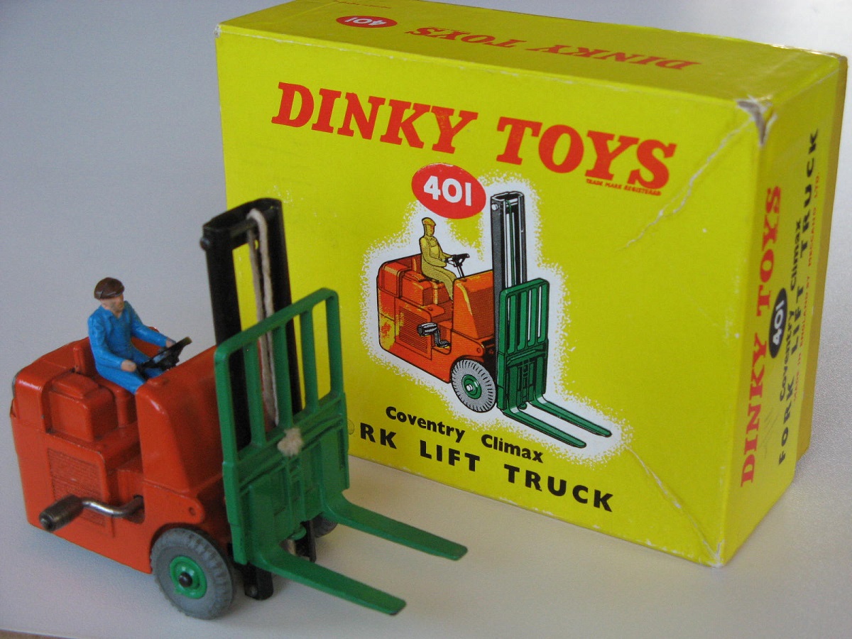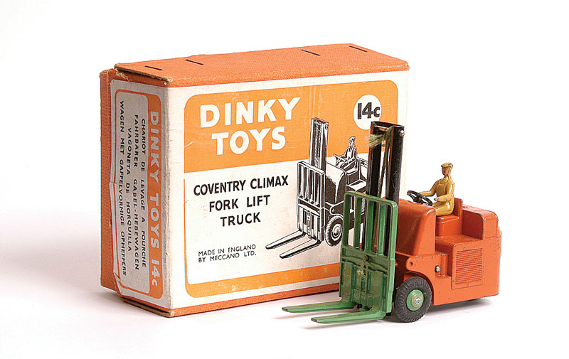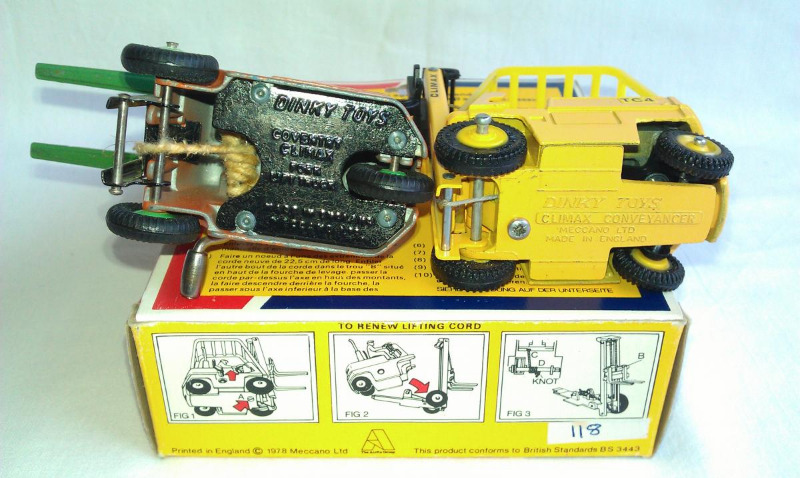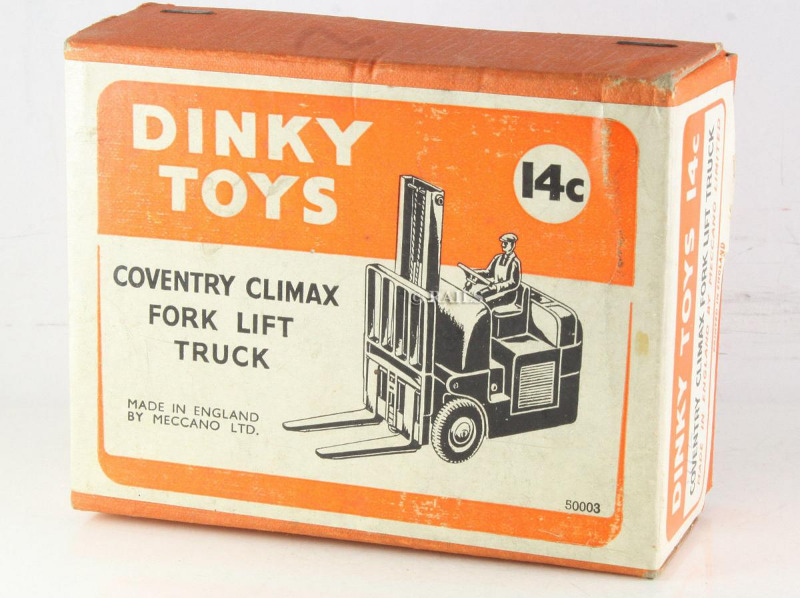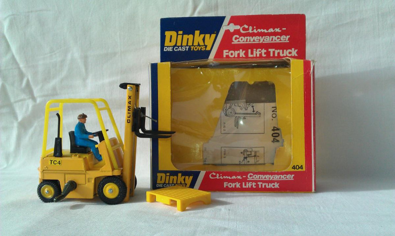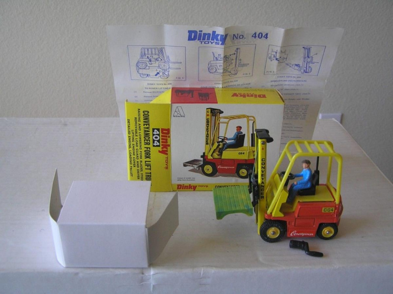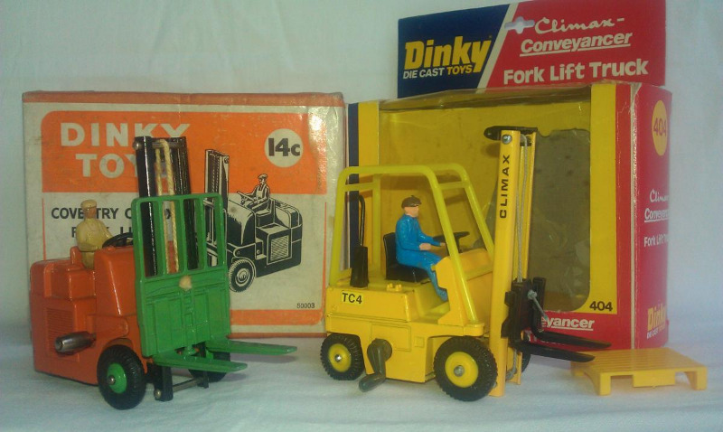 Just received the first issue Dinky Toys 14c Coventry Climax Fork Lift Truck and the last issue 404 Climax Conveyancer Fork Lift Truck, both with box. The forklift truck is produced in 1949 and is manufactured still during the closure of the plant until 1980. I find it interesting to bring the development of this model in picture. In DTCA I did not find an existing topic 14c, 401 or 404. However, in TMT, but not fully until the end of Binns Road. The model is classified as a Commercial Vehicle: 1) 14c UK: 1949-1954 - Orange, Brown or Dark Red, Green Fork. Tan driver - 108 mm - 1954 renumbered to 401 2) 14c French: 1950-1951 - Orange, Yellow Fork ???, Tan driver - 108 mm - Text baseplate ??? Pictures??? 3) 401 UK: 1954-1964 - Orange with Green Fork. Tan driver - 108 mm - Renumbering of 14c 4) 597 French: 1959-1961 - Orange with Yellow Fork. Tan driver - 108 mm - baseplate:Meccano Paris Dinky Toys Chariot A FourchesCoventry Climax Assemble en France 597 5) 404 UK: 1967-1980 - Red and Yellow, later Orange and Yellow - 97 mm - CG4 decals, Pallet, Instruction sheet. Steerable. 6) 404 UK: 1978-1980 - Yellow - 97 mm - TC4 decals, Pallet, Instruction on the back- and underside of the box. Steerable. I show pictures of my two models and boxes in which the differences are visible. I have box 14c with stock number 50003 on the lower right front. This box variation I have not seen in TMT or DTCA. My box 14c is priced 7/2 with pencil. Through my collection catalogs and leaflets can I reconstruct that my box in March 1951 in the store is priced. The stock number is (re) introduced around 1950 and starts with 5 digits at 50000. My stock number 50003 (March 1951) does not match the model number 14c. Box 582 Pull More Car Transporter (1953) represents stock number 50582 which matches the model number 582. I don't know if the stock numbers after the renumbering were still be used. I have not seen examples of that. I add some photos of a French Export 14c box. This box is also mentioned in TMT, but no picture. There are several box, model and color variations of the truck 14c, 401 and 404. I found 13 box variations of the Fork Lift Truck: 1. 14c UK - orange lid box - orange label - orange model lettering 2. 14cUK - orange lid box - orange label - black model lettering 3. 14c UK - orange lid box - orange label - orange model lettering - stocknumber 50003 4. 14c French - orange lid box - orange label - white model lettering Chariot A Fourche 5. 14cUK - orange lid box - green label - green model lettering 6. 14c French Export - red lid box - yellow label - black model lettering Chariot A Fourche 7. 401 UK - Blue striped lid box - red model lettering 8. 401 UK - Yellow lid picture box - black model lettering - yellow under box 9. 401 UK - Yellow lid picture box - black model lettering - blue under box 10. 597 French - Yellow lid picture box - black model lettering Chariot A Fourche - yellow under box 11. 597 French - Yellow lid picture box - black model lettering Chariot A Fourche - blue under box 12. 404 UK - White Yellow carded picture box - black model lettering 13. 404 UK - Red Yellow Blue hanged window box - white model lettering I hope at reactions in this forum with additions of information and variations, even for model 404. OK ... of course ... I know. .. the later models, such as 404 have plastic parts, but to speak with the daughter of Frank Hornby: 'Aren't they Dinky!'. It deserve a place in this forum too. I'm from 1946, but hope that also younger members the stunning 'modern' models from the period 1960-1980 will show and discuss in this forum. I have for instance some questions about changing the name of model 404. Why were the name of model 404 changed in 1967 from Coventry Climax to Conveyancer Fork Lift and why were model 404 after that in 1978 changed in Climax Conveyancer? Did the Coventry company no more exist in 1967? Is model 404 a reproduction of a real one from an other company than Coventry? I am a Dutchman (not the flying Dutchman) and don't know enough about the British Companies, but I am interested to know that. I hope that UK members can solve these questions.