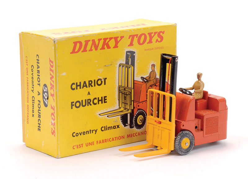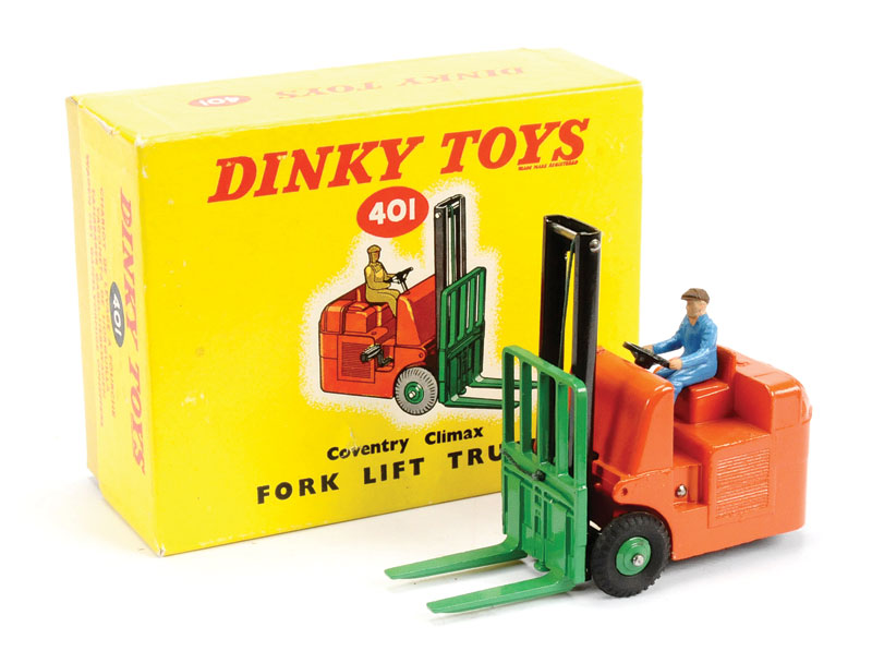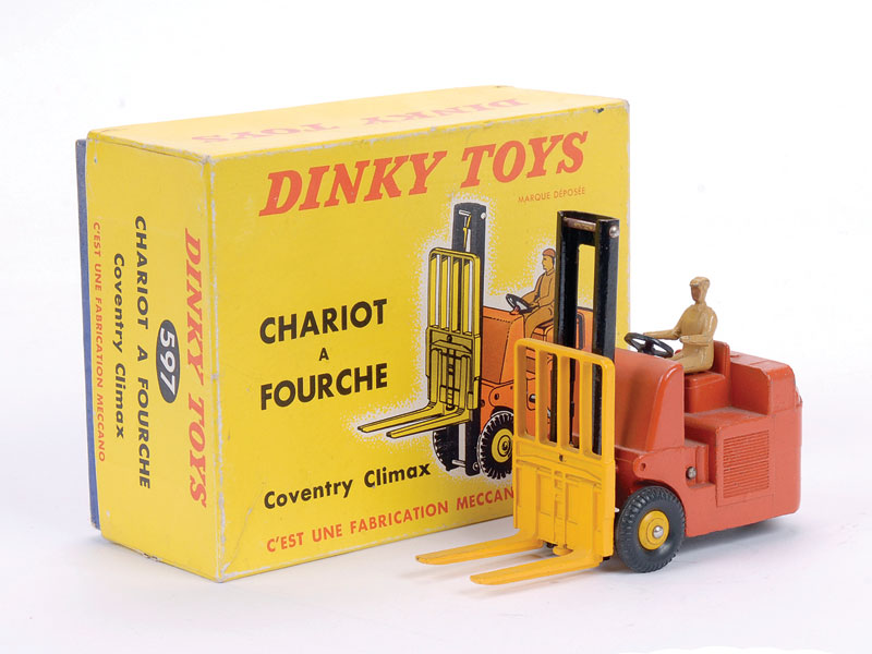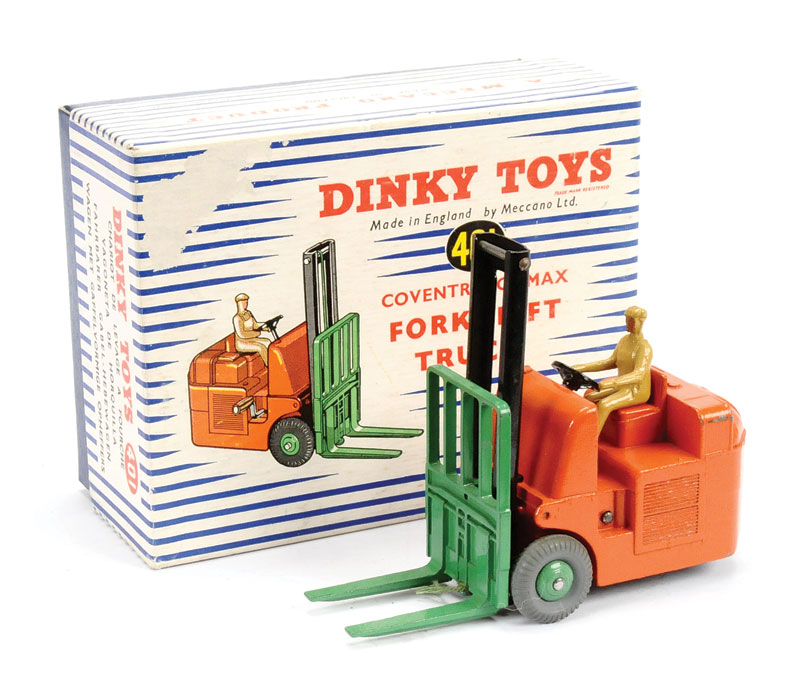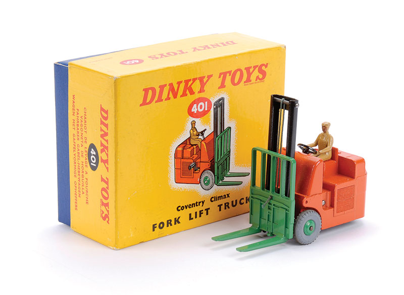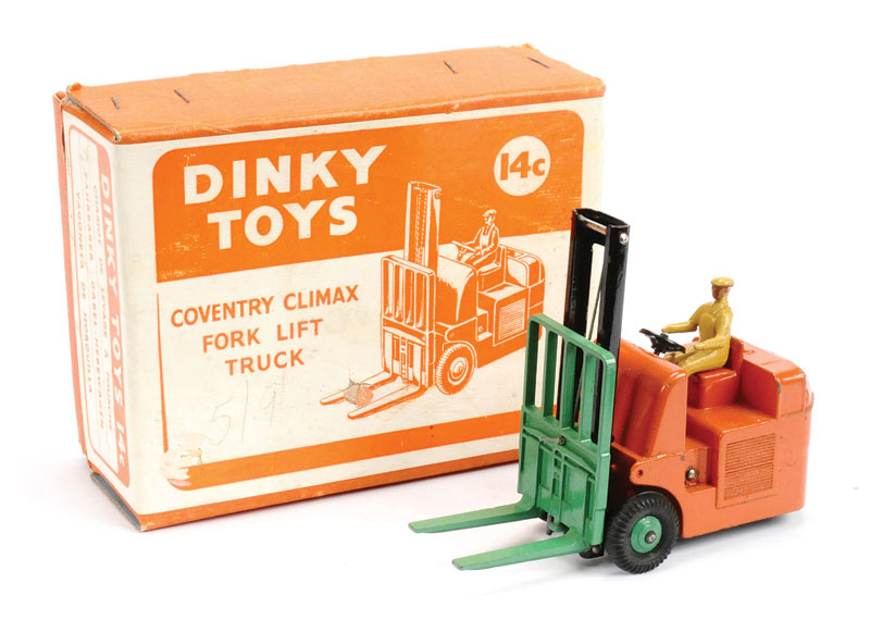Just received the first issue Dinky Toys 14c Coventry Climax Fork Lift Truck and the last issue 404 Climax Conveyancer Fork Lift Truck, both with box. The forklift truck is produced in 1949 and is manufactured still during the closure of the plant until 1980. I find it interesting to bring the development of this model in picture. In DTCA I did not find an existing topic 14c, 401 or 404. However, in TMT, but not fully until the end of Binns Road. The model is classified as a Commercial Vehicle: 1) 14c UK: 1949-1954 - Orange, Brown or Dark Red, Green Fork. Tan driver - 108 mm - 1954 renumbered to 401 2) 14c French: 1950-1951 - Orange, Yellow Fork ???, Tan driver - 108 mm - Text baseplate ??? Pictures??? 3) 401 UK: 1954-1964 - Orange with Green Fork. Tan driver - 108 mm - Renumbering of 14c 4) 597 French: 1959-1961 - Orange with Yellow Fork. Tan driver - 108 mm - baseplate:Meccano Paris Dinky Toys Chariot A FourchesCoventry Climax Assemble en France 597 5) 404 UK: 1967-1980 - Red and Yellow, later Orange and Yellow - 97 mm - CG4 decals, Pallet, Instruction sheet. Steerable. 6) 404 UK: 1978-1980 - Yellow - 97 mm - TC4 decals, Pallet, Instruction on the back- and underside of the box. Steerable. I show pictures of my two models and boxes in which the differences are visible. I have box 14c with stock number 50003 on the lower right front. This box variation I have not seen in TMT or DTCA. My box 14c is priced 7/2 with pencil. Through my collection catalogs and leaflets can I reconstruct that my box in March 1951 in the store is priced. The stock number is (re) introduced around 1950 and starts with 5 digits at 50000. My stock number 50003 (March 1951) does not match the model number 14c. Box 582 Pull More Car Transporter (1953) represents stock number 50582 which matches the model number 582. I don't know if the stock numbers after the renumbering were still be used. I have not seen examples of that. I add some photos of a French Export 14c box. This box is also mentioned in TMT, but no picture. There are several box, model and color variations of the truck 14c, 401 and 404. I found 13 box variations of the Fork Lift Truck: 1. 14c UK - orange lid box - orange label - orange model lettering 2. 14cUK - orange lid box - orange label - black model lettering 3. 14c UK - orange lid box - orange label - orange model lettering - stocknumber 50003 4. 14c French - orange lid box - orange label - white model lettering Chariot A Fourche 5. 14cUK - orange lid box - green label - green model lettering 6. 14c French Export - red lid box - yellow label - black model lettering Chariot A Fourche 7. 401 UK - Blue striped lid box - red model lettering 8. 401 UK - Yellow lid picture box - black model lettering - yellow under box 9. 401 UK - Yellow lid picture box - black model lettering - blue under box 10. 597 French - Yellow lid picture box - black model lettering Chariot A Fourche - yellow under box 11. 597 French - Yellow lid picture box - black model lettering Chariot A Fourche - blue under box 12. 404 UK - White Yellow carded picture box - black model lettering 13. 404 UK - Red Yellow Blue hanged window box - white model lettering I hope at reactions in this forum with additions of information and variations, even for model 404. OK ... of course ... I know. .. the later models, such as 404 have plastic parts, but to speak with the daughter of Frank Hornby: 'Aren't they Dinky!'. It deserve a place in this forum too. I'm from 1946, but hope that also younger members the stunning 'modern' models from the period 1960-1980 will show and discuss in this forum. I have for instance some questions about changing the name of model 404. Why were the name of model 404 changed in 1967 from Coventry Climax to Conveyancer Fork Lift and why were model 404 after that in 1978 changed in Climax Conveyancer? Did the Coventry company no more exist in 1967? Is model 404 a reproduction of a real one from an other company than Coventry? I am a Dutchman (not the flying Dutchman) and don't know enough about the British Companies, but I am interested to know that. I hope that UK members can solve these questions.