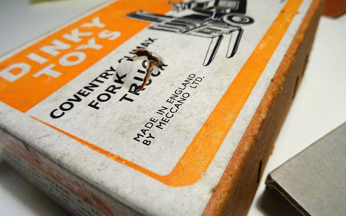 Just found an addition for my earlier boxes section of the Coventry Climax Fork Lift Truck (orange + black printing). On the snap shots attached it is invisible that the box lid got very unfortunately pierced by the handle during transport. A big pity and shame after near 70 years of life intact. Nevertheless a fair addition for a mere 30 dollars as the price sticker attached demonstrates, so it's no use returning it. I will have it restored. The seller and I agreed on a refund of 10 euros for a comforting bottle of wine. Quality control stamp: mT 851. Kind regards, Jan