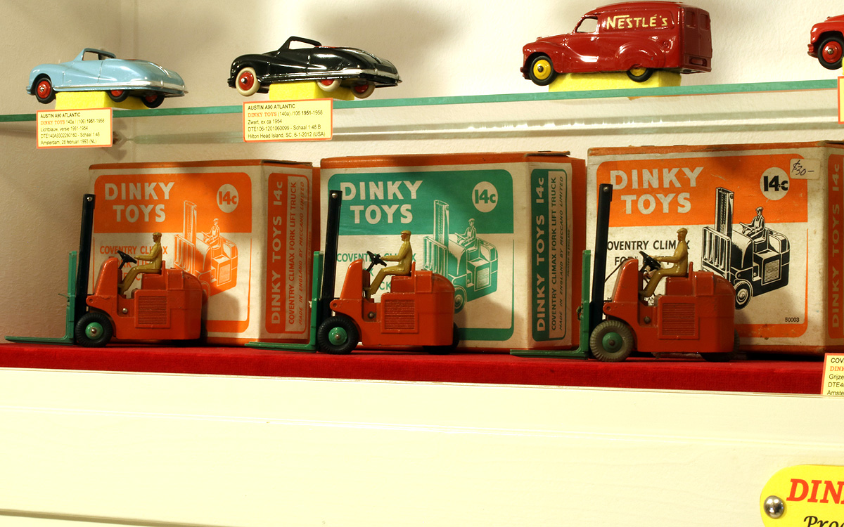 Dinky Toys Fork Lift Truck: Summary and Conclusion. Regarding the very valuable comments from members here, TMT and elsewhere I come to the following general conclusions about the production of Dinky Toys Fork Lift Truck: (N.B.: The numbers of the boxes with corresponding photos in this summary have been placed in the probable order of appearance.) 1) 14c UK: 1949-1954. Orange, Brown or Dark Red. Green Fork. Tan driver - 108 mm - 1954 renumbered to 401. Not steerable. UK Box: 5. orange lid box/green label/green model lettering 1. orange lid box/orange label/ orange model lettering 2. orange lid box/orange label/black model lettering 3 orange lid box/orange label/ black model lettering with stock number 50003 2) 14c French: 1950-1951. Orange with Green Fork. Tan Driver - 108 mm - UK cast model 14c with UK base plate. Not steerable. French box: 6. red cardboard lid box with yellow label/black model lettering 4. orange lid box/orange label/white model lettering 3) 401 UK: 1954-1964. Orange with Green Fork. Tan driver - later blue driver - 108 mm - Renumbering of 14c. Not steerable. UK box: 7. Blue striped lid box/red model lettering 9. Yellow lid picture box/black model lettering/blue base 8. Yellow lid picture box/black model lettering/yellow base (Note the later blue driver on the photo!) 4) 597 French: 1959-1961. Orange with Yellow Fork. Tan driver - 108mm - UK cast mould - French base plate with text: Paris Meccano Dinky Toys Chariot A Fourches Coventry Climax Assemble En France 597. Not steerable. French box: 10. Yellow lid picture box/black model lettering: Chariot A Fourche/yellow base 11. Yellow lid picture box/black model lettering: Chariot A Fourche/blue base 5) 404 UK: 1967-1978. Red and Yellow, later Orange and Yellow - 97 mm - CG4 decals. Conveyancer on Fork Lift. Pallet. Instruction sheet. Steerable rear wheels. 12. UK box: White yellow red carded picture box/black model lettering 6) 404 UK: 1978-1980. Yellow - 97 mm - TC4 decals. Climax on Fork Lift. Pallet. Instruction on the back- and underside of the box. Steerable rear wheels. 13. UK box: Blue/yellow/red hanged window box/white model lettering. I make the summery complete as far as I know. I can still make changes or additions. I hope still to get response to my questions about the name change of model 404. Kind regards to all. Jan Oldenhuis