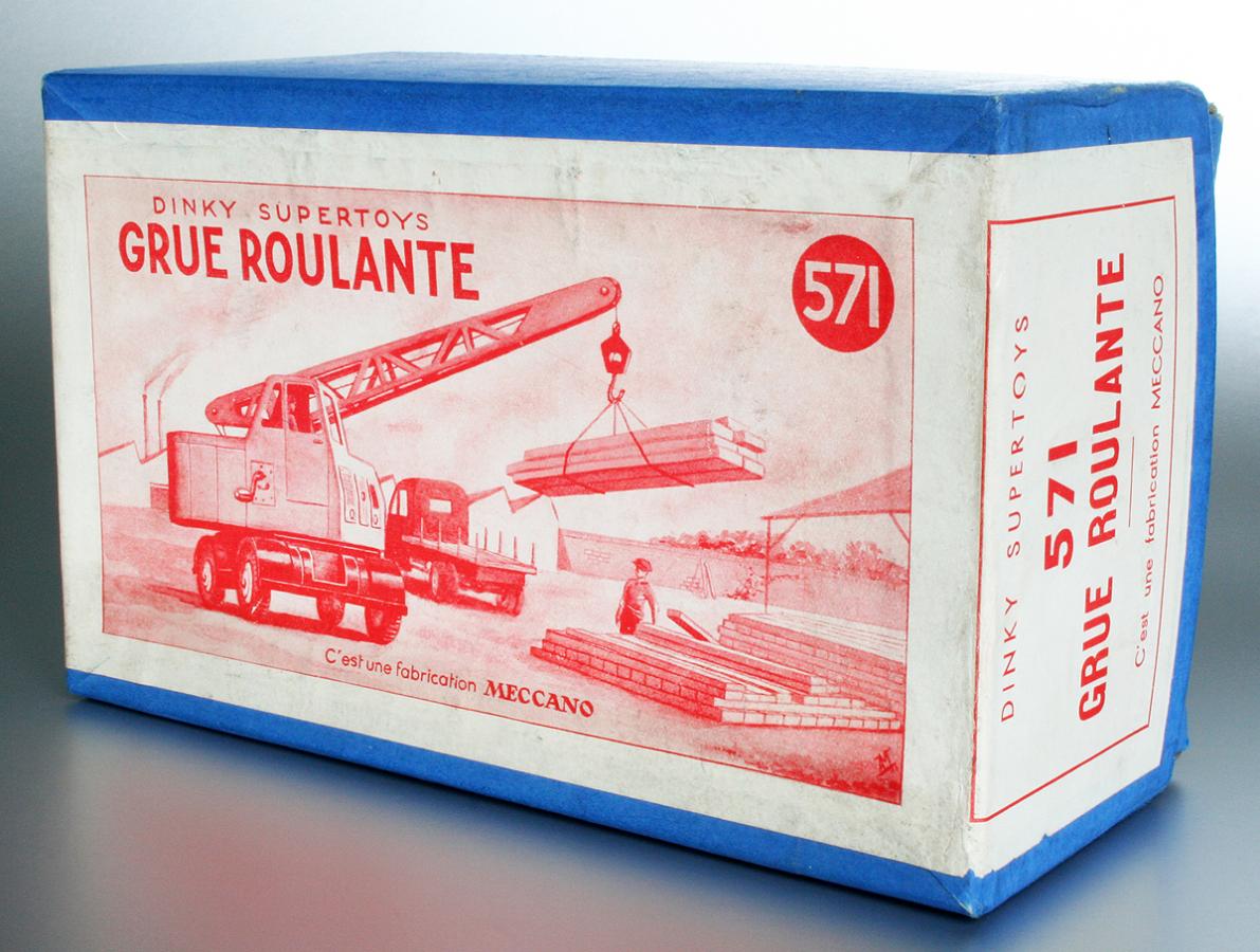 Hi Jan, thanks for this revision. What is the rationale behind the box sequence 5, 1, 2, 3? I would be eager to know because I never found out. I like these exceptional early 1950s French boxes of the 14c Chariot a fourche(s), 561 Bulldozer, 562 Dumper basculeur automoteur and 571 Grue roulante. But also the earlier red ones for the Chariot a fourche(s) and 27ac Tracteur Massey Harris et remorque ependeur d'engrais. And of course the more common later French assembled ones in the period 1959-1961, also including the 551 Rolls-Royce and 972 Camion-grue roulante (20 tonnes) - 20-Ton Lorry Mounted Crane 'Coles'. A nice, well-illustrated article about these 'unusual' French boxes (and their contents) was published by Brian Salter in Model Collector of June 2006, pages 67-73. My rather scarce box for the 571 Grue roulante - Coles Mobile Crane pictured below. Kind regards, Jan W.