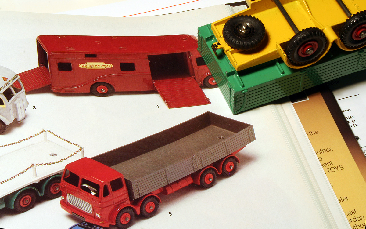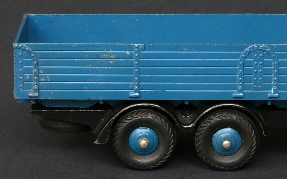 The new acquisition of an all dark blue first type no. 501 Foden 8-Wheel Wagon is the reason for some additional pictures and observations. The idea for issueing this Foden Wagon must have come up very early post-war because a brass mock-up for this model (DT&MM p.248, ill.423) seems to have smooth hubs and, moreover, makes the impression to be executed on a ca. 1/60 Dinky Toys scale, with the early small treaded black tyres. Apparently the concept for this model predates the concept of the bigger, actual 1/48 scale Dinky Supertoys. That may be the reason too that the picture on its box differs in style, is more old-fashioned than later issues. The Foden Wagon makes part of the first five Dinky Supertoys, announced in Meccano Magazine of August 1947. These eight-wheelers were all fitted with the ridged Dinky Toy hubs and 20 mm black herringbone treaded tyres. The first models to be issued featured an all black chassis, black accentuated front wings and a silver strip on both sides of the cabin. The brick red and dark blue examples here demonstrate that. The early boxes contained abundant staples, which can be very harmful to the model, if placed incorrectly inside the box. This model must be stored on its side with cabin below the only stapleless side of the underbox. Otherwise serious rubbing will be the result. In fact the article by Rob van Hoort in the present April 2017 issue of the DTCA Journal tells considerably more about the early Fodens than I can offer here. So let me recommend to you to read that elaborate, abundantly illustrated article. It was big fun for me to take the photos of Robs marvelous models! Kind regards, Jan Werner