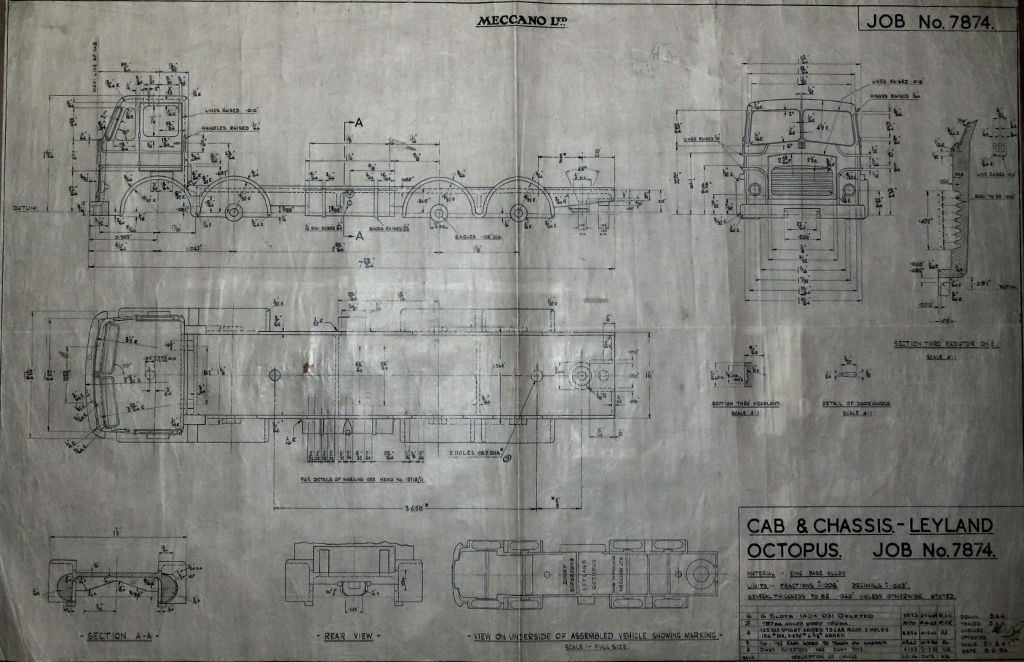 ) In the course of a quarter of a century of research, I have seen too many boxed models that are simply unrelated and have been as a result of a collector either not knowing his hobby, or simply enjoying his hobby without any regard to accuracy. For many, a box is just a box, and if it is better than the original, who really cares. In the case of this model having 934 on the rear base of the drop-side wagon component, the initial drawings for the Leyland Octopus, in particular Job No. 7874 were commenced on 8 June 1954, with the first changes to the drawing being effected on 21 March 1955 incorporating a change from Dinky Toys to Dinky Supertoys. (See copy of drawing below) Whether a model in a box quality stamped January 1955 would have contained a drop-side rear with 934 on it would in all probability be highly unlikely. But like everything else with Dinky Toys and Supertoys, logic may not play any part and all cards are on the table, spanner and all!! One thing stands out why did Meccano specify 901 and 934 on the models depicted in the above Posts when the unit itself was identical to both models. Yet another Meccano Mystery of which we are left to ponder! Ron - there is nothing wrong with your camera! It is a sharp image in the area under discussion! I will be providing a link for these fascinating exchanges to the 934 Leyland Octopus Wagon Topic, as the subject does have relevance to that Topic as well. Kind regards Bruce H. (150) 20180105/0100/1175
