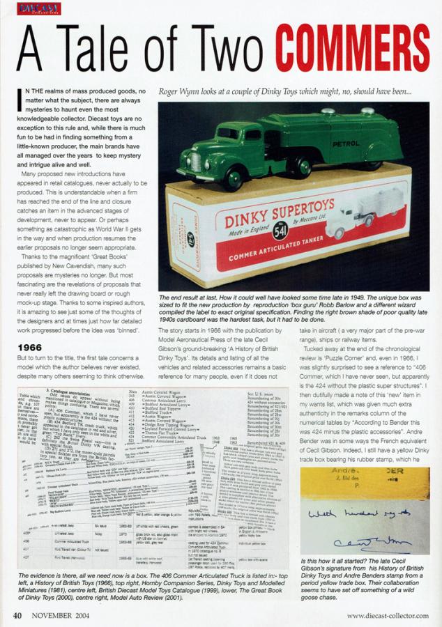 Jan Werner wrote: Hi Bruce, you may have read the article 'A tale of two Commers' by Roger Wynn (Brian Salter) in Diecast Collector 85 (November 2004) p. 40-43. He found no evidence of the possible existence of a 406 either. If not, and you wish, I could send the scans to you. Kind regards, Jan Hello Jan Many thanks for bringing the Diecast Collector article to my attention, as I previously was unaware of it. At the start of this century, I had to make some radical changes to my lifestyle when I moved into semi-retirement. My numerous magazine subscriptions, from aircraft monthlies, war history issues as well as model magazines had to be severely culled. As for model magazines, it was a toss between Diecast Collector and Model Collector, so I resorted to the only true and tested means toss a coin. After three goes I finally settled on Model Collector! I would certainly appreciate a scan of the article, and many thanks for your generous offer. Kind regards Bruce (150) 20160424/914/1219