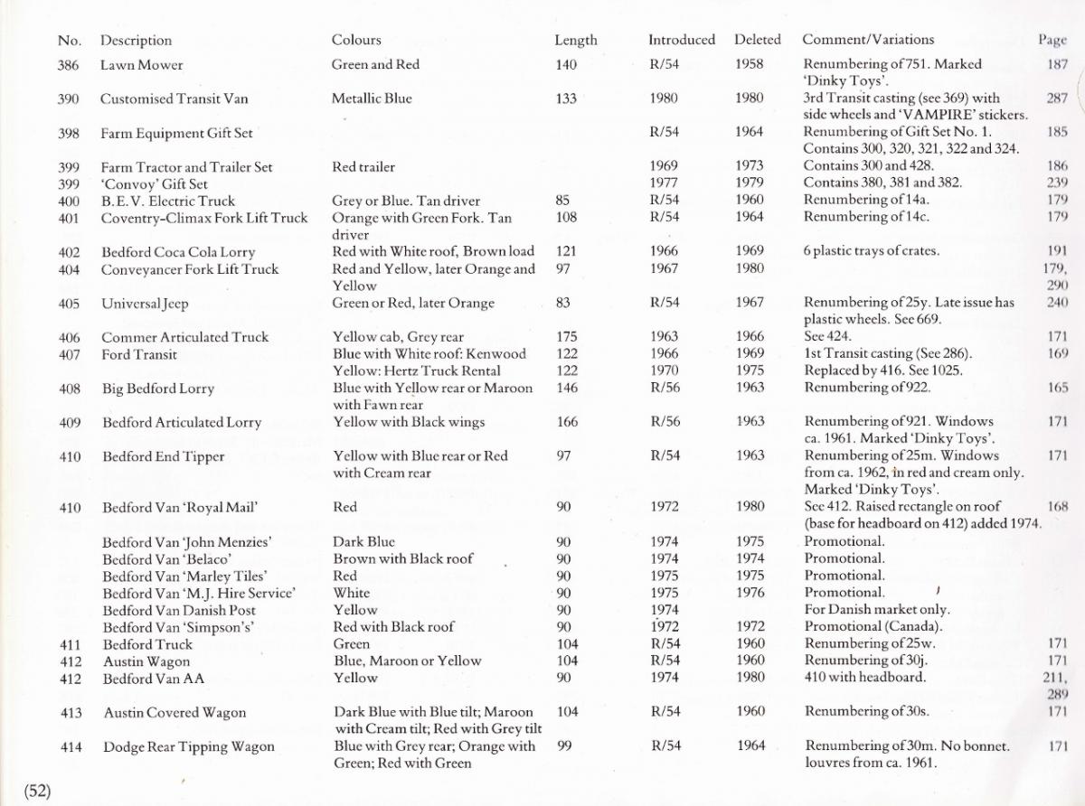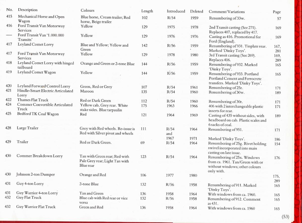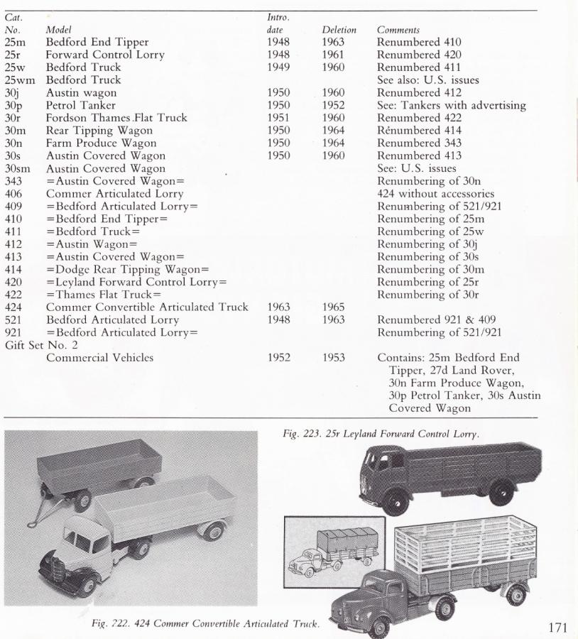 After reading the Diecast Model article quoted by Jan above, I decided to conduct my own investigation based on some of the books I have in my library. This is what I came up with, the result being an almost identical conclusion to that reached by the author of the Diecast Collector article, Roger Whynn confirming my original assessment at the start of this Topic. If we were to go back to the very early days of interest in collecting Dinky Toys we find Cecil Gibsons History of British Dinky Toys 1934-1964, the original in-depth analysis of these famous toys. The book was first published in 1966, at a time when the 424 Commer Convertible Articulated Truck was in its final days of production and with the Meccano factory still in full operation although starting to show the pains of bad management and a difficult work-force. In Gibsons book, the remarks beside the 406 are According to Bender, this was 424 minus the plastic accessories. The question arises, Who was Bender? Perhaps a fitting name for one who bends the rules. According to the Preface, Andr Bender was a tower of strength and I was lucky enough to be given a pre-publication copy of his index of Dinky Toys, which was a great help to me wrote Cecil Gibson. (Has anyone seen Benders Index of Dinky Toys?) What surprises me is that Gibson apparently did not contact Meccano to ascertain the veracity of Benders advice on the 406. Perhaps he did, but was met with a wall of indifference. Then in 1981, two years aftere the factory closed came the first edition of what was to become The Authorised History of Dinky Toys, Mike and Sue Richardsons book being Volume 4 in The Hornby Companion Series, Dinky Toys and Modelled Miniatures published by New Cavendish Books. This monumental work was revised and reprinted in 1986, with a second revision in 1989 and two further reprinting occurring in 1992 and 1993. In 1986, Patrick Trench prepared a Dinky Toy Compendium that was available as a separate purchase through Cavendish Books, but by the 1993 reprint, the Compendium was included as part of Volume 4 itself. At no stage through any of the revisions were there changes to the inclusion of 406 Commer Articulated Truck. It is interesting though, the drawing of the 424 on page 171 shows the Commer in a darker colour scheme than the usual light yellow. (See the image below.) In 1982, Frank Thompson includes the 406 in his The Dinky Toy Price Guide with this notation: This model was mentioned by Gibson, but no details were given. Export only item, being 424 minus the plastic accessories. There are two colours; the first is a yellow cab with grey rear and blue plastic wheels, windows and interior. The second colour, dark green with black rear, green plastic wheels, etc. is much rarer and worth treble. Original price when issued 9/11. Issued 1963. Deleted 1966. (A strange price for a model when one could buy the complete unit including accessories for the same price!) Just where Thompson obtained his information about the 406 as well as it having an interior I can only speculate and Gibson never mentioned the two colours and two different coloured plastic hubs. In 1984, John Ramsays British Diecast Model Toys (actually with the title The Swapmeet & Toy Fair Catalogue of British Diecast Model Toys) arrived on the scene. It was notable in that although the 424 Commer Convertible Articulated Truck was included in the catalogue, the 406 Commer Articulated Truck was not, and yet the catalogue acknowledges the use of Cecil Gibsons book in the preparation of his book. I do not have a copy of the 2nd, 3rd and 4th Editions of John Ramsays British Diecast Model Toys but by the 5th edition published in 1993, the 406 had appeared with the notation, Yellow/Grey, Blue plastic hubs, Supertoy, (424 without accessories), with the entry for the 424 reading, Yellow/grey, 406 plus trailer canopy & stake body fittings. So by 1993 the catalogue had included the 406 and had upgraded its status to that of a Supertoy, when the 424 was packaged in a Dinky Toys box with its base plate bearing the words COMMER DINKY TOYS. Right up to the latest 15th Edition published in 2015, it still carries the same description as recorded 22 years earlier. In 1996, the renowned French authority on French Dinky Toys, Jean-Michel Roulet published A Guide Dinky Toys Anglais Tous Les Modeles De 1953 A 1980. Page 65 mentions the 424 and on Page 61 is reference to the 406, voir 424. Then on page 145, the 406 is mentioned as having been available as from 1962 one year before the 424 was released. Then we come to 2000 when the updated and enlarged treatise on Dinky Toys by those venerable authorities on all things Dinky, Mike and Sue Richardson The Great Book of Dinky Toys was published. With all that had preceded it, one would have thought that the 406 would have been worthy of closer examination, but no. There it is on page 125, under the remarks column casting used for the 424 Commer Convertible Articulated Truck, but with an added entry in the column marked BOX, we are now informed that the model came in an individual yellow box. It appears that each time a new book is written, the 406 has some added features! Firstly it was the basis for the 424, then it became a Supertoys when the 424 remained an ordinary Dinky Toys and then it became available one year before the 424 was released, and yet strangely, no one was watching when it came out! Not forgetting its interior, the availability of two colour schemes and finally, its very own yellow-lidded box. However, we should really check the details that came out of the Meccano factory rather than relying on reference material published by well-meaning enthusiasts and experts. In 1982, Frank Thompson wrote that the 406 was for export only and its period in production was 1963 to 1966, with 424 being May 1963 to 1966. On checking the 1963 Canada catalogue (an over-print of the USA Catalogue published in May 1963) with the print code of 13/1063/50 (October 1