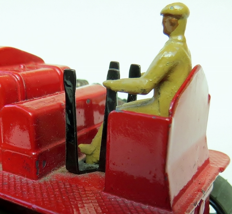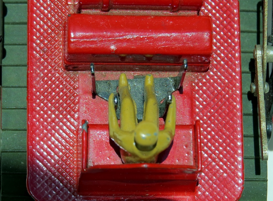 640 215 There is a spigot on the left foot of the driver, I think in the early models the lever assembly is connected to the foot. I say so because the headless driver is loose on the blue tractor and when he moves the levers moves too. I will know more when I disassemble these for restoration. Here is a picture of the seat assembly: