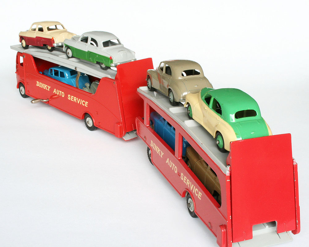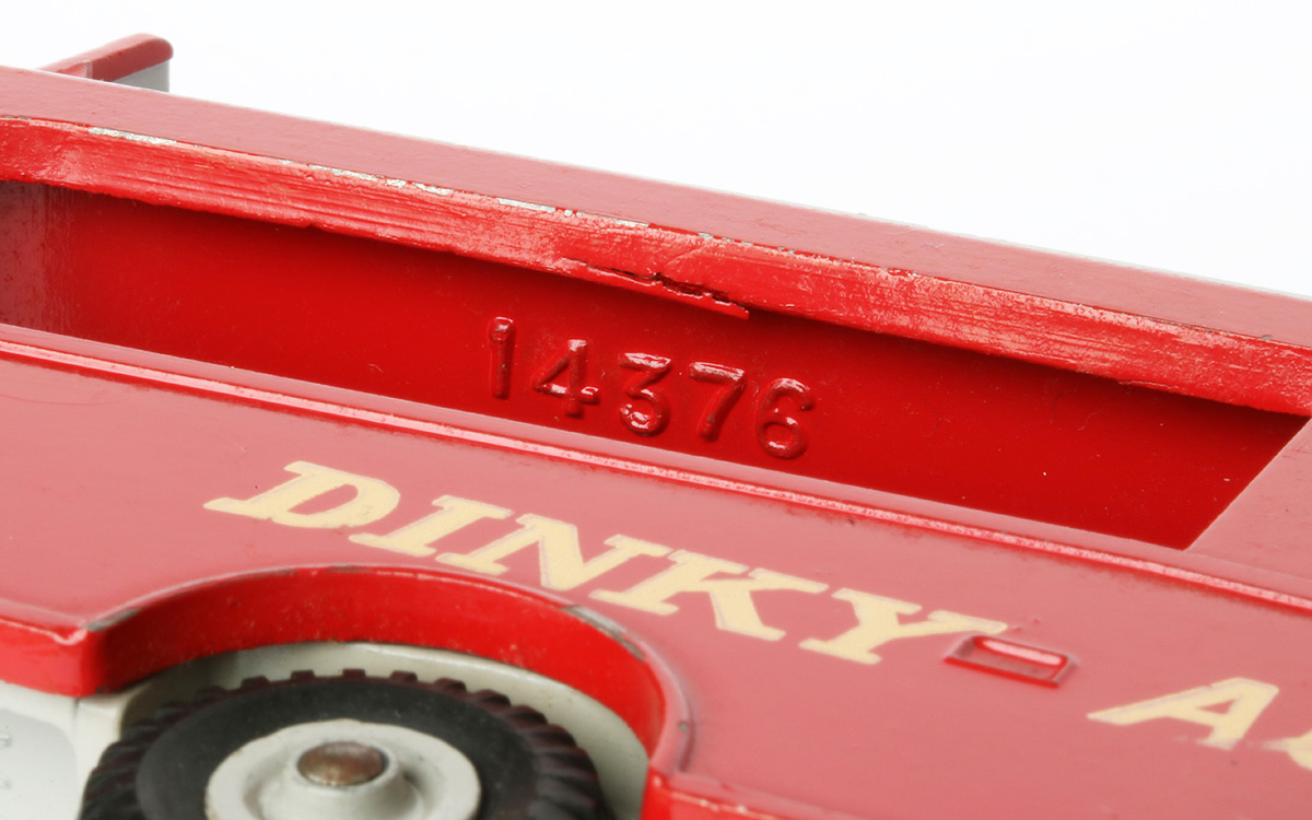 Something I have never noticed before, neither with this model, nor with any other Dinky Toy: the very factory job numbers cast into the respective component parts themselves! In this case it is the no. 14366 for the hinged top deck of the 984 Car Carrier and no. 14376 for the body of the 985 Car Carrier Trailer. The job numbers for this vehicle couple can be found listed on page 162 of the GBofDT. But ... the drawing (and consequently the job no.) of 14366 appears to be missing on this list. So, we can add job no. 14366 to our lists of Dinky Toys factory jobs! Now I wonder if other enthusiastsin our DTCA community have found similar examples of cast-in job numbers on other Dinky models. Kind regards, Jan