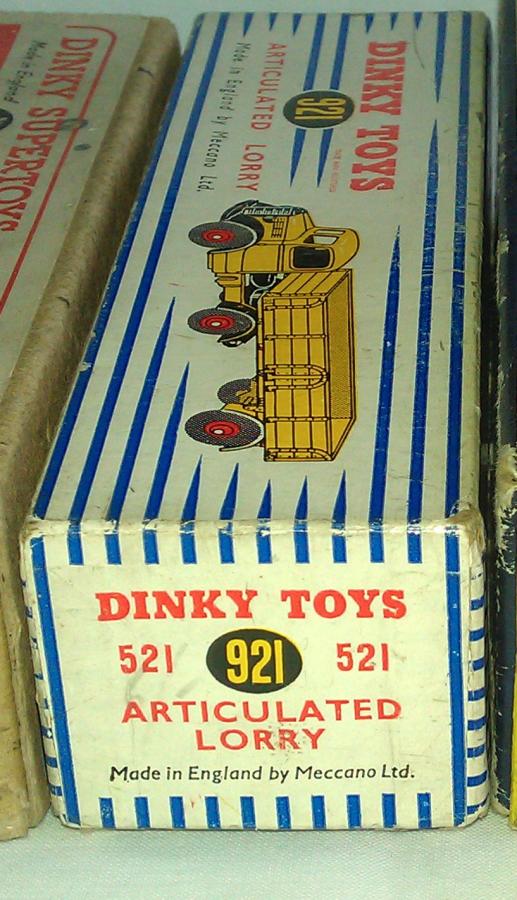 For a better view. Here are my close pictures of the 3 casting variations of the platform of the Bedford Articulated Lorry that I found till now. When there are more, I ask members to add pictures of these variations. And ... I ask members to post pictures of a blue/orange labeled 521 box and of a blue/white striped 409 box. These are missing in this topic till now. I have a question about the 921 blue white striped box. My 921 box is a so called dual numbered box with both numbers 921 and 521 on the box. This was during the time of transition to the new numbers around 1954. Has anyone a 921 box without dual numbers? I wonder if this box exists. Kind regards, Jan O