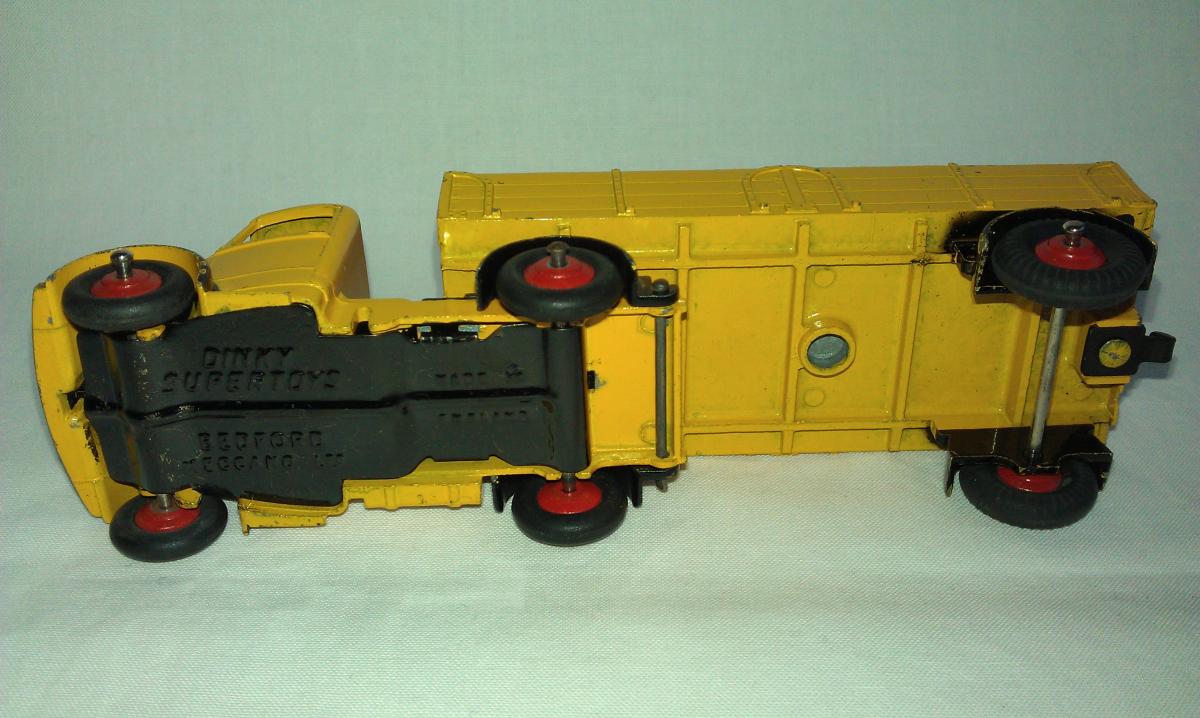Ever since the UK catalogue of October 1953, the mudguards of the trailer were painted yellow (see under d). Bedford and Ford were throughout DT production one of the most common models in the total range of Dinky Toys. In the literature I found the following special and general characteristics that can help us to specify the individual models because there is no number on the baseplate or cast of this model and there are much several boxes. The Great Book of Dinky Toys Mike and Sue Richardson p 136: a) 521: red or yellow with black wings; 1948-54 marked Dinky Supertoys then Dinky Toys; brown box with Supertoys label, then blue box with Dinky label. (Mike forgot the green box with label!)