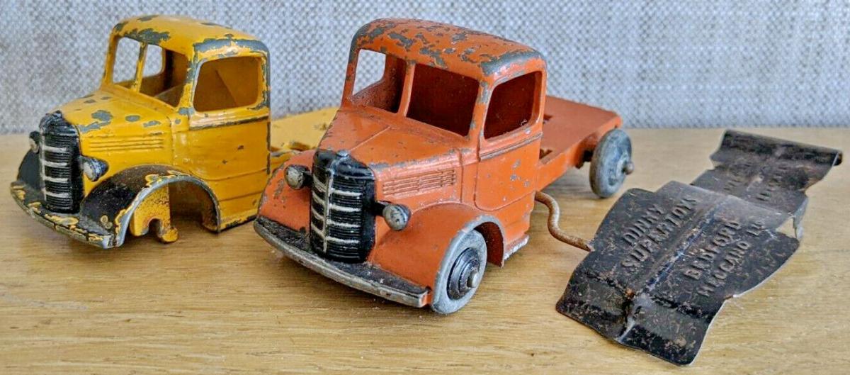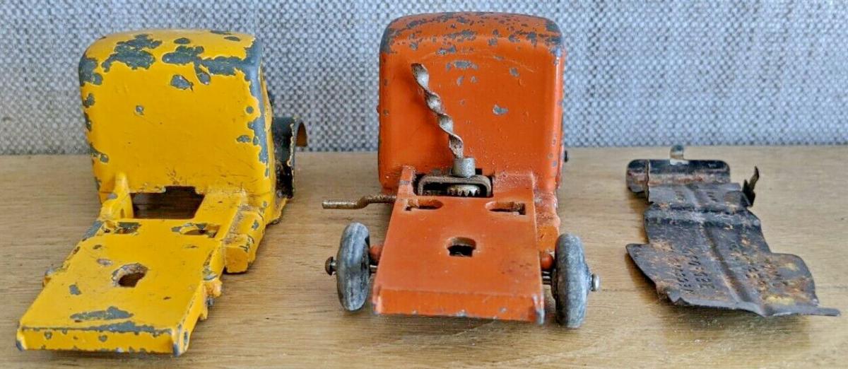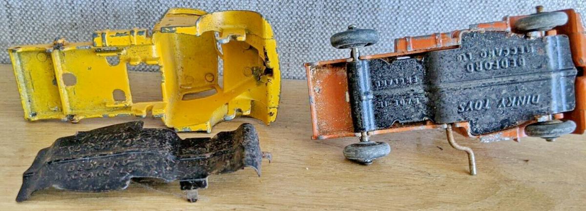 On the photos of Jan W you can see how ingenious Meccano Liverpool has designed one basic chassis for the Bedford Truck, on which 5 different Bedford models are based. On Ebay I found a stripped 521 Bedford Artic and a 1st version 25m Bedford End Tipper where this is clearly visible. In the left corner of the platform to the cabin of the 521 you can already see a casting variation (reinforcement) compared to the flat angle of the 25m. If you look closely you will also see the yellow and orange lugs on the side of the platform chassis near the rear axle to keep the hub and tire off the chassis to prevent chafing. I haven't tried it myself yet, but I think it's quite easy to remove the base plate with coupling from the truck.On the photo misses the 582 Pullmore Car Transporter, using the same basic chassis of the Bedford Truck. I found this stripped 582 Bedford Truck, also already with the reinforcement in the left corner of the platform to the cabin and the reinforcement of the fuel tank with a rectangular plate on the top. You clearly see the tabs of the baseplate fastened to the platform chassis of the truck. On Ebay I also found the coupling piece for the trailer that belongs to the 582 truck.25v Bedford Refuse Wagon was produced the longest, until 1965 (17 years!!). These Bedfords were very popular and I think Meccano Liverpool cashed much money with them.Meccano France produced in the same period and in the same way the 25 Series Studebaker (25o, 25k, 25l, 25m, 25p, 25q and 25r) and not to forget the very nice 25 Series Ford.Kind regards, Jan O