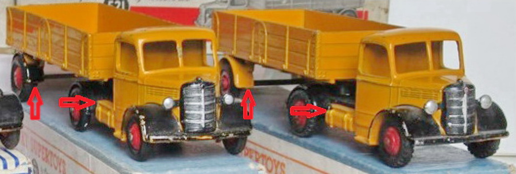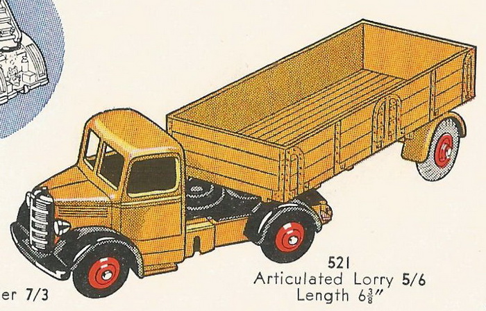 This is a very interesting Meccano drawing of Job 13630 Wheel Hub for .098 Axles posted by Andrew Lance under #9. When you compare it with the 12876 Bedford Artic assembly drawing you will see an arrow drawn to the rear wheel of the trailer stating 'wheel Job No 13630. I think this Job is the change from Ridged Hubs to Grooved Supertoy hubs. The Supertoy hubs needed larger holes for the thicker axle. Under point 3 of Job 13630 it says 'Hole 110/106 dia was 106/104 dia, dated 7-10-52. In the top left corner of the 13630 drawing you see a table with the title 'used on'. In that table Job 12876 is mentioned, being the Bedford Artic. In that table 12 Job numbers are entered, so this Job is applied on 12 models. This means that the Supertoy hubs were mounted on the Bedford Artic trailer from 7-10-52 onwards. *) Point 6: Base was Job 12677, dated 14-1-53. In the assembly drawing 12876 you see an arrow on the front to the left wheel with the indication Base Job No 12845. Given the mention under point 6 'Base was Job 12677', dated 14-1-53, I explain that this new Job on 14-1-53 the Dinky Supertoys baseplate changed to Dinky Toys baseplate. I think this is also related to point 7 of the Job List, discussed below. You must keep in mind that the cab / chassis has its own Job No 12841, as shown in the drawing above the roof of the Bedford truck. *) Point 7: Mask spraying on rear mudguard deleted, dated 20-1-53. This Job refers to the rear mudguards of the trailer, which are no longer need painted black, but are now coloured yellow. This change is dated 20-1-53, almost simultaneously with the change from Dinky Supertoys to Dinky Toys base plate on 14-1-53. I think this was done to give this Bedford Artic its own Dinky Toys appearance to distinguish from a Dinky Supertoys. Points 6 and 7 were initialled by the same person. Below you can see the picture of 521 in the 1952 catalogue with black mudguards and ridged hubs on the trailer rear wheels compared to an existing issued model 521. In the 1953 catalogue below you can already see the 521 with yellow mudguards and grooved Supertoys hubs on the trailer rear wheels compared to an existing issued model 521-921.This is proof that the change from Dinky Supertoys to Dinky Toys baseplate and from ridged hubs to Supertoy hubs for the Bedford Artic took place as early as 1953, rather than 1954, as is commonly stated.