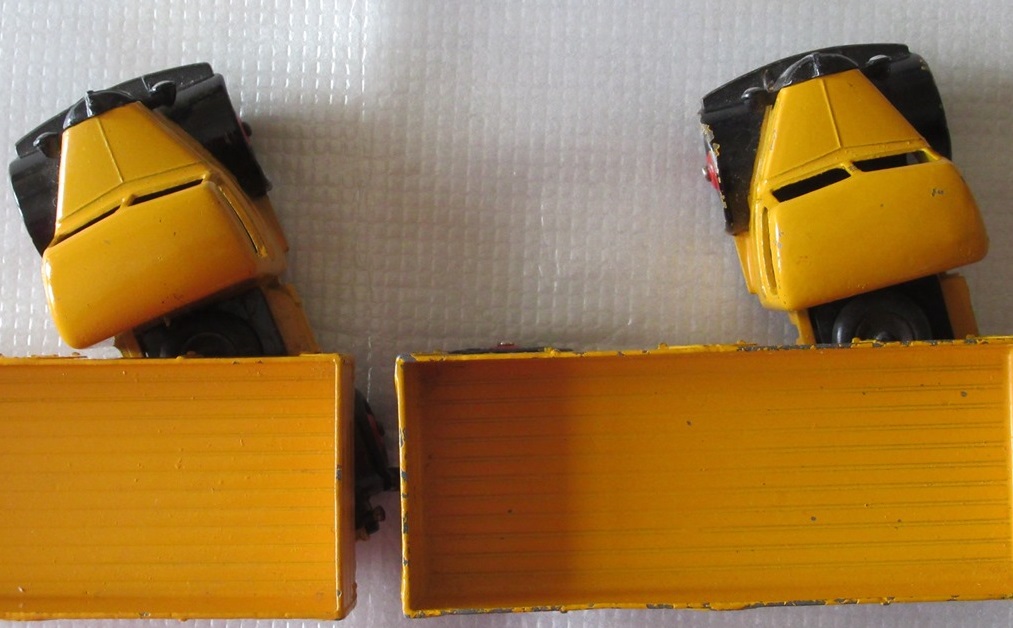 Hello Richard. One thing continues to intrigue me when I see your overview photo of the Bedford Artics, but it can be optical illusion. That's why I'm asking you this. It seems as if the right Bedford Artic with yellow trailer mudguards does not have a reinforcement plate on top of the fuel tank, but this is not clearly visible on the photo. If it had no reinforcement on the fuel tank, I would find this very special, because the left Bedford Artic with black mudguards, which was previously issued, does have a reinforcement plate on the fuel tank. Has the right Bedford with yellow trailer mudguards a plate reinforcement on the fuel tank or not and does it have a Dinky Toys base plate? Kind regards, Jan.