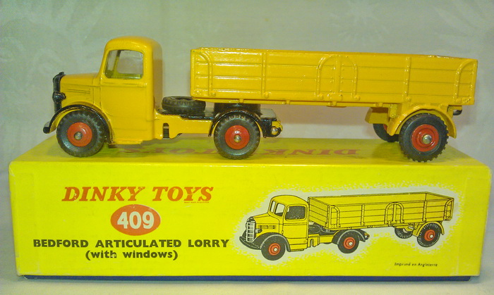 Jan, a very nice photo of the real Bedford Artic, now with a closed trailer. Your photo is very close to the Dinky Toys 521 early model. The fuel tank and the contour lines of the door and hood match well. The black mudguards and a different color for the cabin and trailer also stand out. For the fun, I made an amateur photo of this comparison with my mobile phone.When you compare the semi-trailer wheels between the early and later ones, the early ones indeed are fitted with larger tires (21 mm). For example my late 409 with windows have all wheels the same tires (18 mm). As a result, the trailer doesn't seem to have the same horizontal height as the earlier with large tires, but the 409 slopes slightly towards the rear side. To achieve an equal horizontal height of the trailer, large tires for the trailer wheels are also required. For whatever reason, Meccano Liverpool apparently didn't consistently mount larger tires on the trailer wheels of any model. I post some photos of an early and late Bedford Artic to compare the trailer tires. I take this opportunity to show Richard that my 409 with windows on the left side of the hood also has 2 bars in the ventilation grilles and 3 on the right.Kind regards, Jan O.