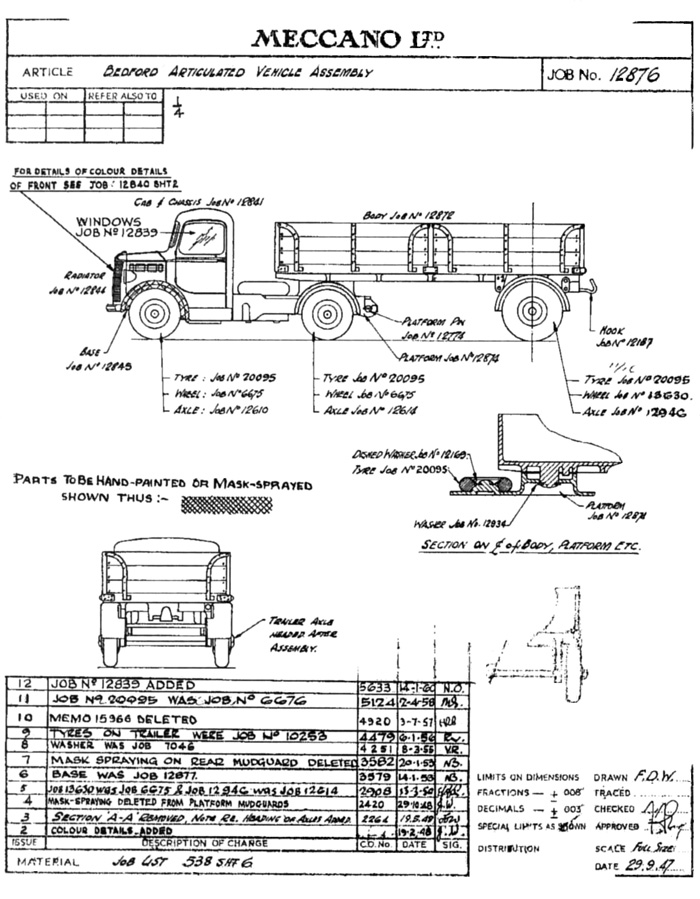 The Meccano drawings 12876 and 13630 give us a lot of information about changes and dates of changes. Now that we have been working on the details of the Bedford Artic for so long, I think I can explain these drawings.