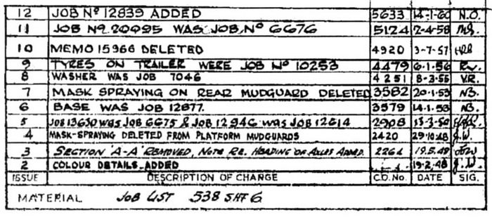 By comparing the job numbers of the drawing with the detailed job list, I can draw a certain conclusion with regard to the explanation thereof, which I compare with existing issued models. Documentation of articles, magazines, catalogues and auctions can also be helpful here. *) Points 2 and 3: I have no explanation for these jobs. *) Point 4: Mask-spraying deleted from platform mudguards, dated 29-10-48 The platform is clearly indicated by arrows on the drawing. I think this Job has to do with the platform, which were painted completely red or yellow at the beginning of production for the very first all red or all yellow version. But the rear mudguards also still had to be painted black by mask spraying. After the completely red and yellow version were ended, mask spraying of the rear mudguards could be stopped and the platform with the rear mudguards could be sprayed completely black now. *) Point 5: Job 13630 was Job 6675 & Job 12946 was Job 12614, 13-3-50.
