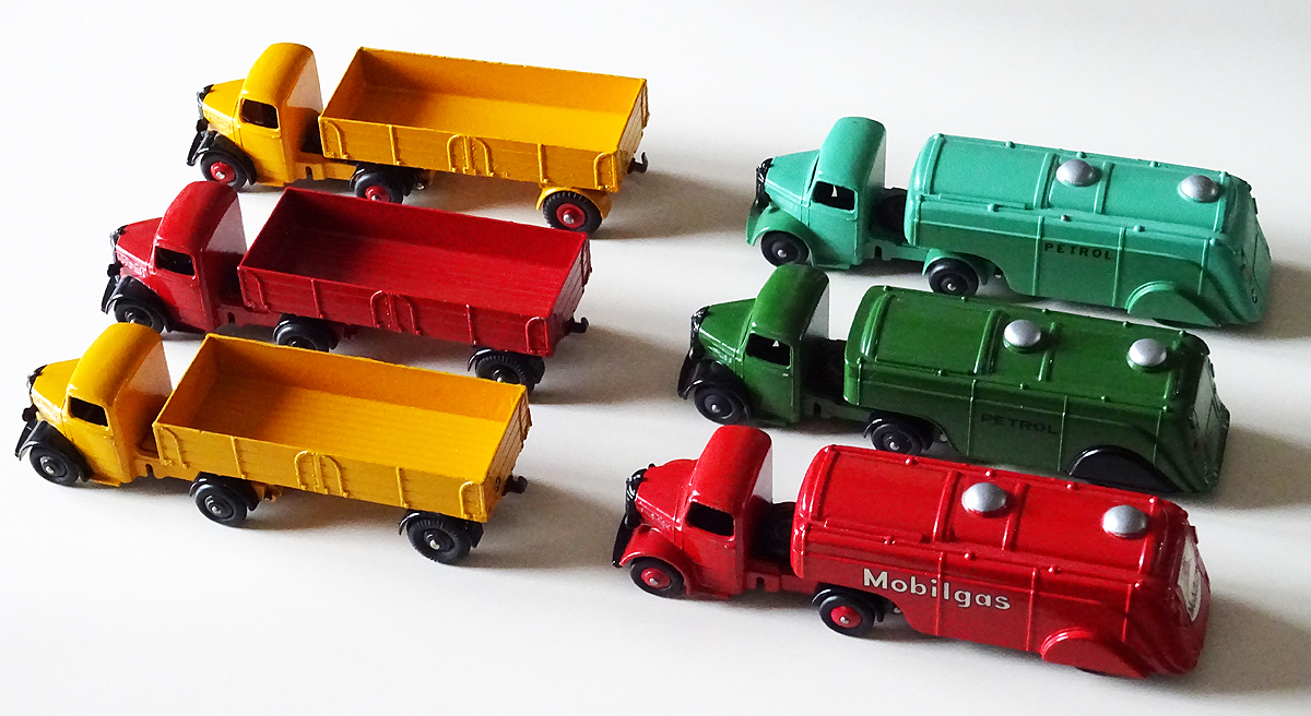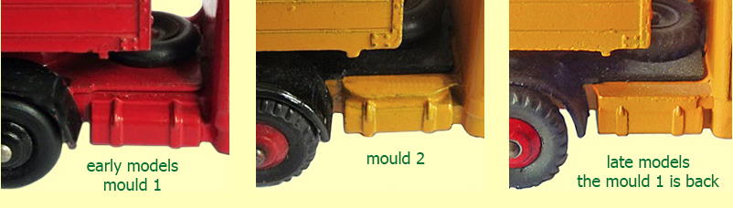 Jacques. With the truck it is indeed striking that different castings alternate and are used again later. The first type of rectangular front fenders for instance came back in the last issues. This is clearly the case and to see on added pictures with the different types of front fenders and the wheel spacers. Note also the 3 different types of front axle support. I suspect that the start of the plate reinforcement of the truck's tank occurred roughly at the same time as the transition from ridged hubs on the trailer to grooved Supertoys hubs around October 1952. The change to Supertoys hubs can be found on drawing Job No.13630 under point 3 and is dated 7-10-52 as shown in comment # 58. The change to plate reinforcement on the tank of the truck is unfortunately not mentioned on the assembly drawing Job No.12876, but undoubtedly on the cab / chassis drawing Job No. 12841 which is unfortunately not (publicly) available. Because they are different components that are produced separately from each other and then linked together, these unexpected combinations from trailer + truck can, in my opinion, arise in transition time from one casting to another and is interesting to notice and research. Jan Oldenhuis, 15 October 2020.