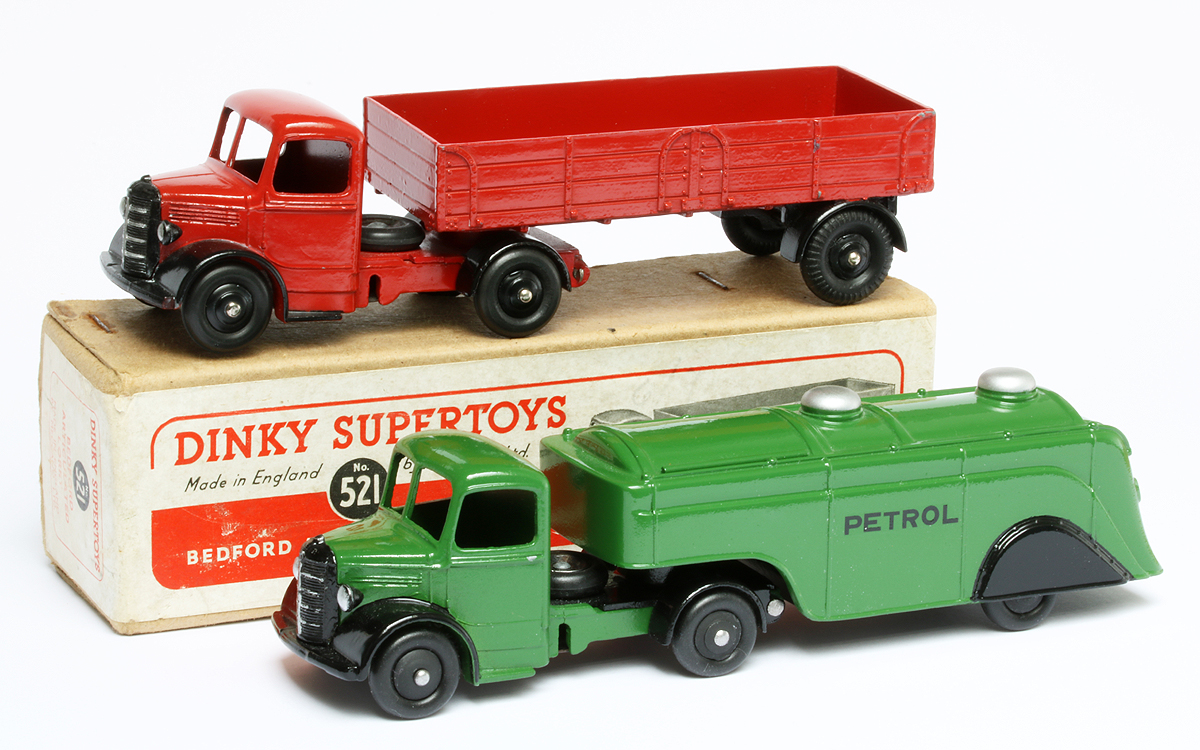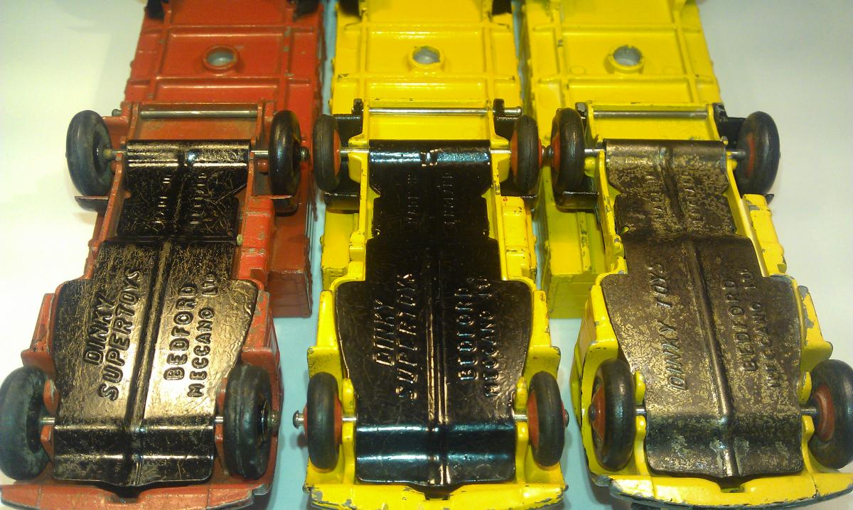 As a collector it is always interesting to compare certain castings of models. On my search for a 521 replacement without plate reinforcement on the fuel tank of the truck, I came across these sold 2 Bedford Artics on the QDT website. I was amazed at the casting differences of these 2 models. The 521 Artic with Supertoys hubs on the trailer has a fuel tank on the truck without plate reinforcement on the top, while the earlier model with ridged hubs on the trailer has a plate reinforcement on the fuel tank. The model with Supertoys hubs on the trailer was produced after the ridged hubs period on the trailer and logically should have a plate reinforcement on the tank of the truck, but it does not. It can't be a mistake on the assembly line of fitting the wrong wheels on the trailer, because the Suptertoys hubs has a wider hole and a thicker axle. They both have a Dinky Supertoys base. I would like to own such discussion models. Jan Oldenhuis, 13 October 2020.