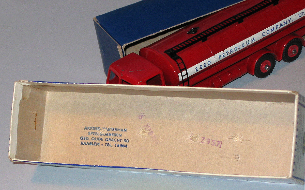I also know that we bought - or were given - first type, old-numbered, pre-1959 French Dinky Toys in regular toys shops well into the early 1960s. Although the distribution flows to Hudson Dobson (USA) and Hausemann & Htte (NL) must have been quite different and separated, one must nevertheless conclude indeed that somehow your Esso Tanker and mine must have belonged to the same or a closely related batch which passed the quality control check at the same time. Kind regards, Jan