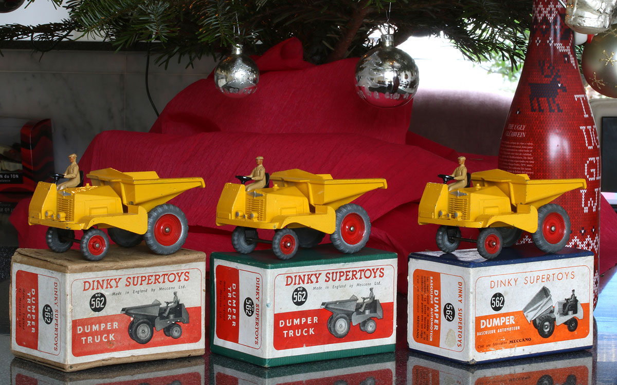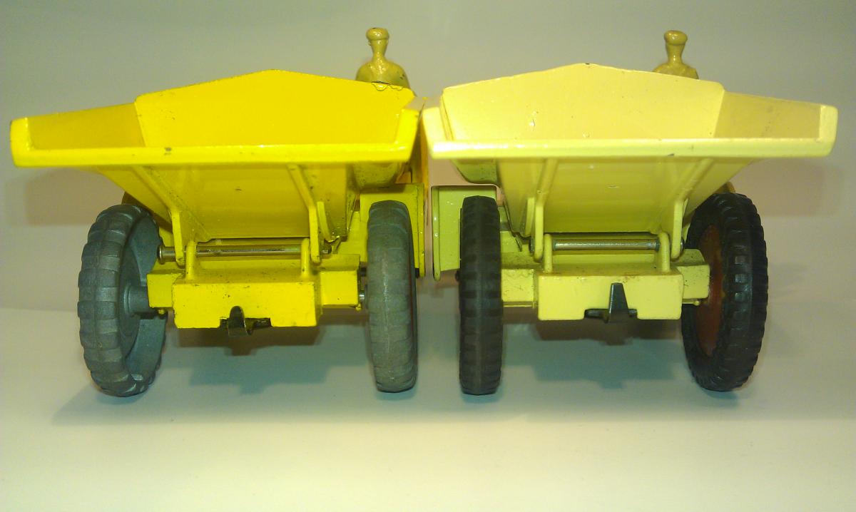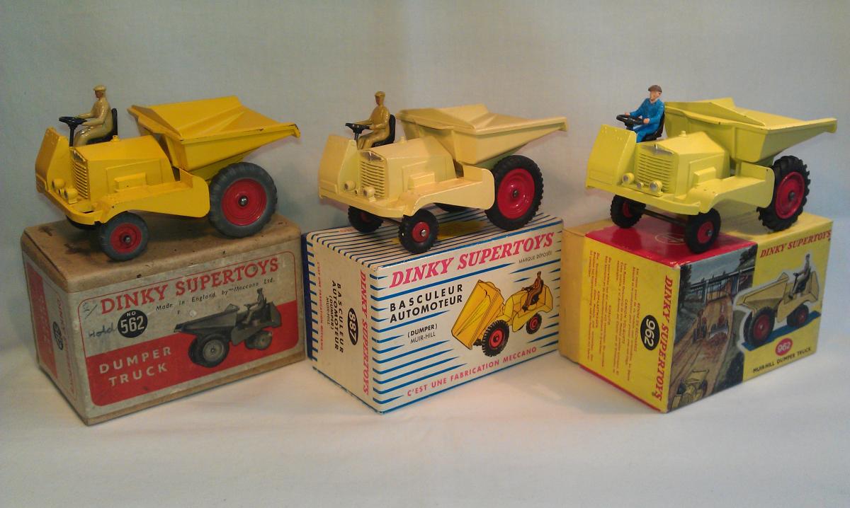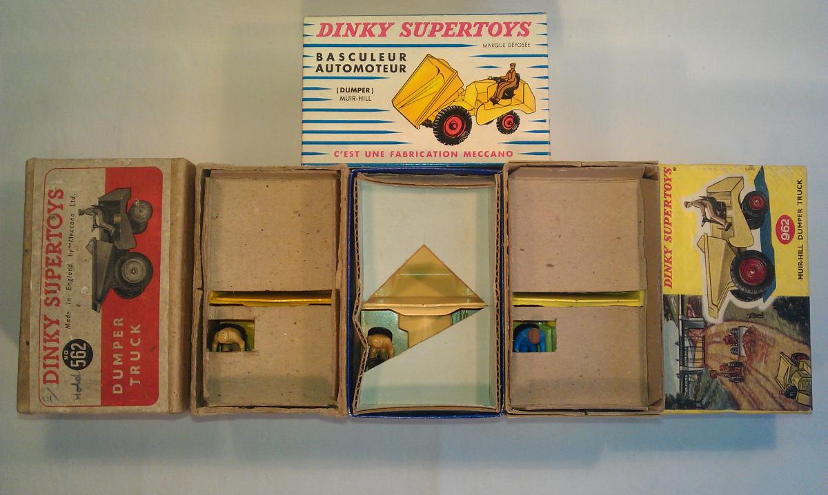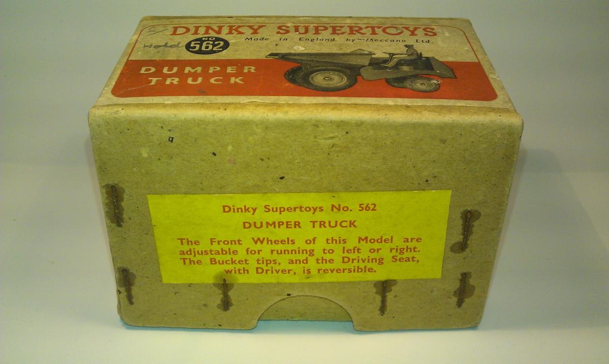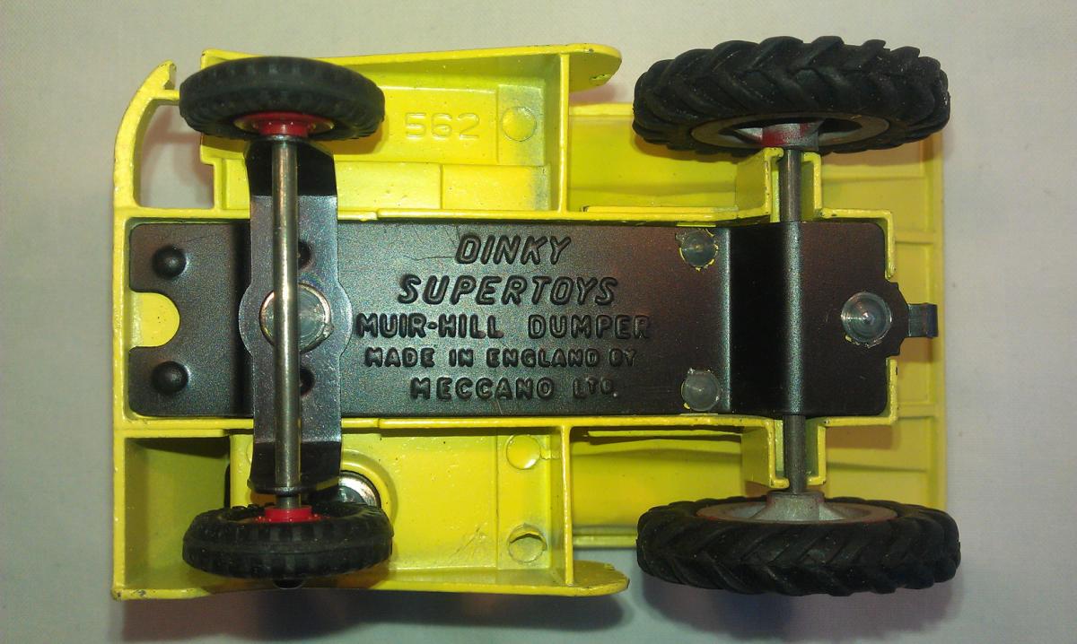 This is my 3rd version of the Muir-Hill Dumper Truck. Light yellow - number 562 in the bottom. Red plastic hubs with black rubber tires. Blue plastic driver. Sales number 962 with 962 box. All my 3 versions are different in colour, hubs and tires and the driver is now painted blue.Be noted that there are more model and box versions.Additions are very welcome.