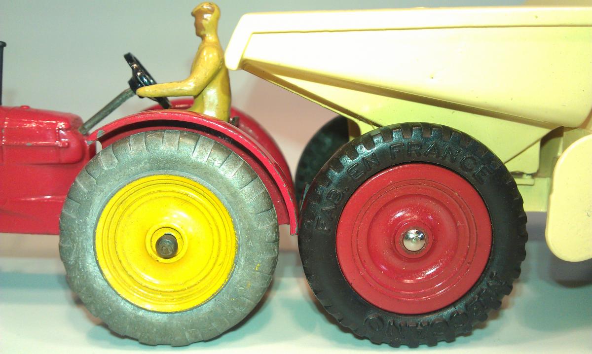 Jan, interesting rear tyres on your French version. Whereas the second Liverpool version has the same tyres as the later Dinky farm tractors, those on the 887 version appear to be the same as those found in 'Meccano' construction sets, although these were usually grey, not black. Is the word 'MECCANO' moulded on the sides of the tyres, as it was in the construction sets? - Kevin.