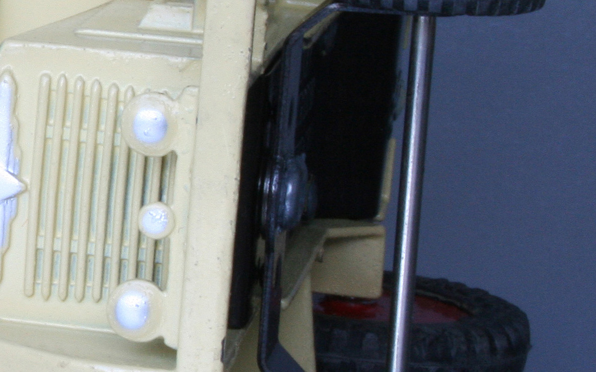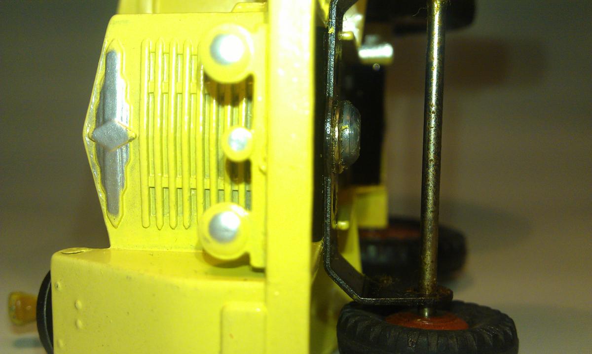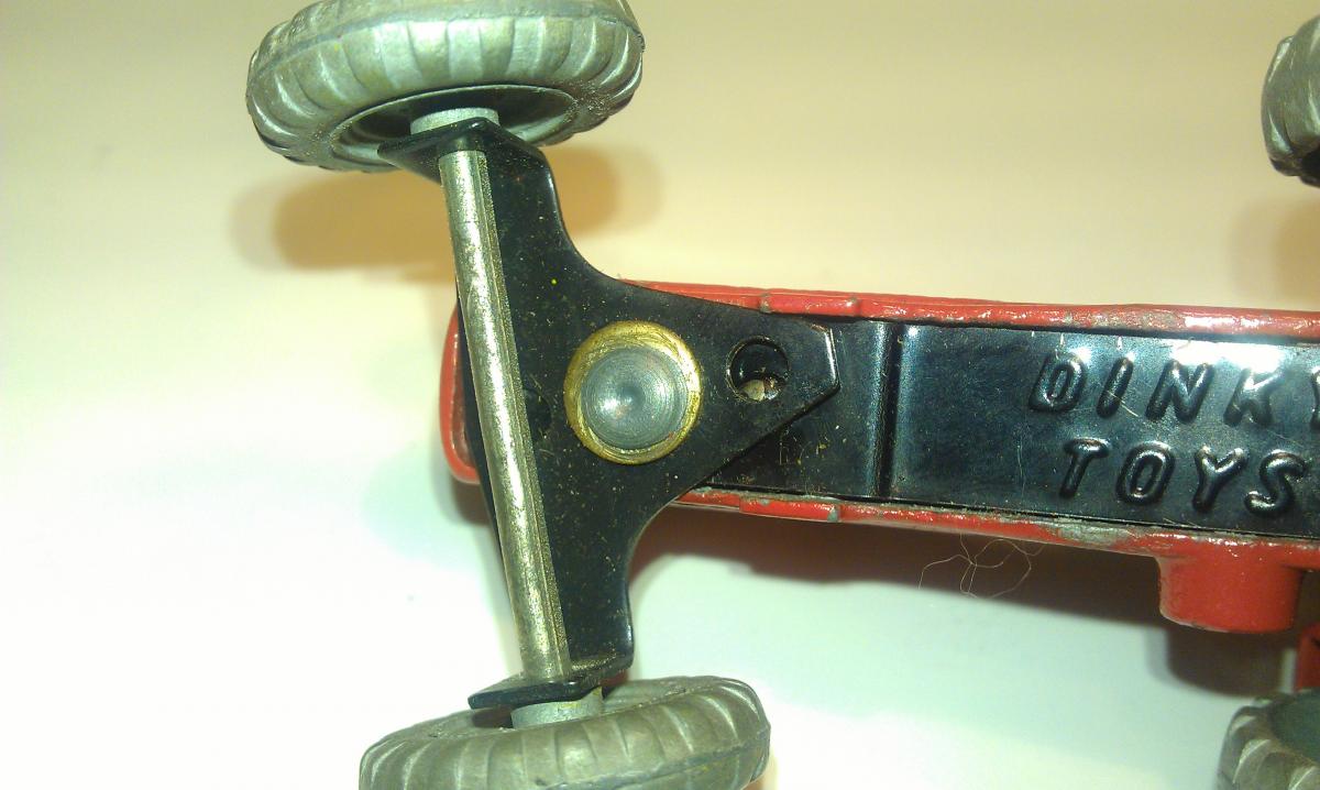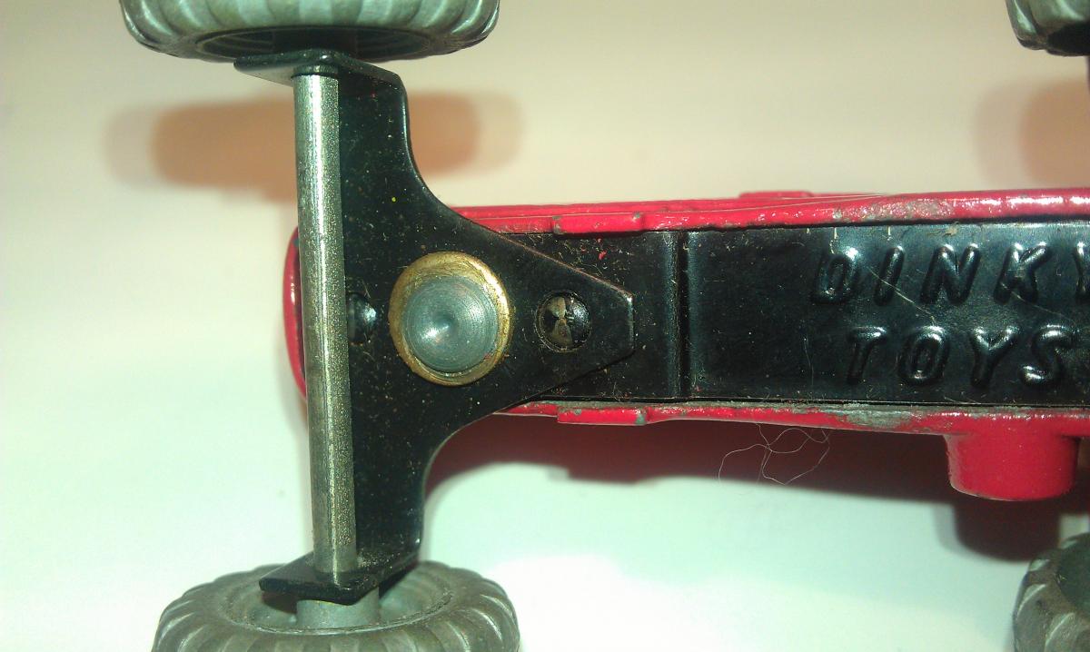 Jan. Thank you for your contribution with more technical details. To compensate for the difference in height between the French 887 and the British 562, according to your TMT contribution to the 887, an (extra?) washer was placed between the body and the front wheel suspension. That can also be seen on your photo. It looks like 2 washers under the front wheel suspension. And that does raise the front. I have compared my 887 once again well. According to my observation as far as I can see is there no washer between the front wheel suspension and the body of my 887, but looks like the front wheel suspension is directly riveted on the pillar of the body. But that is very difficult to see on my 887. There are two pressed-in bumps in the front wheel suspension for adjustable the front wheels for running to left or right. See pictures. My front wheel turning mechanism of the 887 is very tight. I wonder when there are washers placed between the front suspension and the body, or the turning mechanism of the front wheels can be turned too light. The 27a Massey Harris tractor has a similar system, but also without washers between the front wheel suspension and the body and that works very well. Apart from that, there is indeed a difference in height of about 2 mm at the front between the 562 and the 887. So they did not completely succeed to compensate the height difference. Note: Now that we have been discussing a French Dinky Toy, I have also been wondering for a long time about the existence of drawings by Meccano Bobigny. Till now I saw never any French Meccano drawing in discussions while there are shown several drawings of Meccano Liverpool. I hope Richard or Jacques do read this and can explain something about the existence of French Meccano drawings. Kind regards, Jan Oldenhuis, 24-1-2018