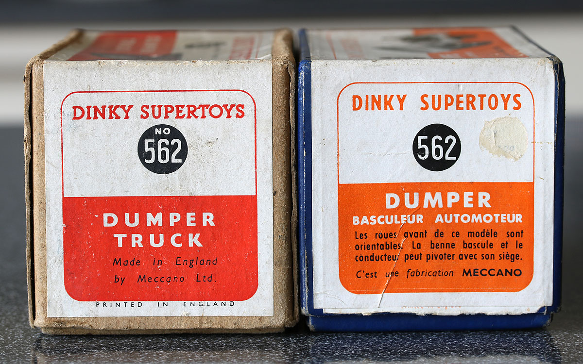 Of the no. 562 Muir-Hill Dumper Truck I took out three boxed examples of the period 1948-1951 this Christmas, to see that the 'French' box is just a British box with the British label overpasted with a French label. Closer observation shows the contours (and tiny part of the lower end) of a narrower (ca. 6.1 cm) label underneath the new French label, which must be the British one in my opinion. The natural card box dates of 1948/49. the green paper covered one 1949/50 and the blue French one 1950/51. I have no blue Britsh one of the same period. Kind regards, Jan