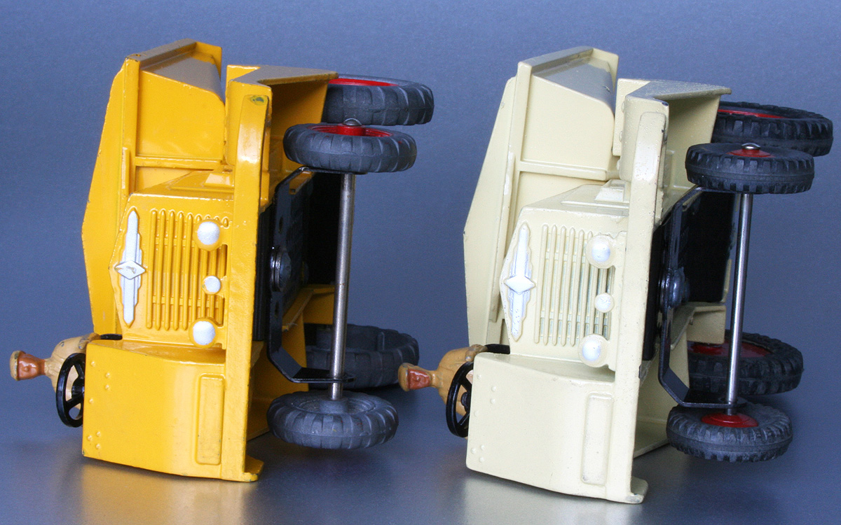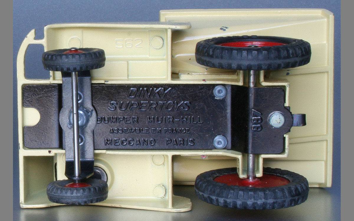 My 1st version Muir-Hill Dumper Truck. Sales number 562, but no model number in the base. Note therivet in the notch to fasten the headlights. My 2nd version: cream - French version with UK model number 562 in the bottom and French model number 887 in the base plate with Assemble en France Meccano Paris. Red hubs with black rubber tires. Cast tan driver. French sales number 887 with French box 887.This is a very remarkable British/French version.