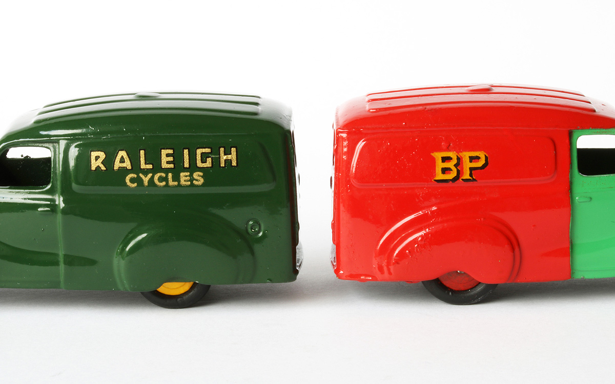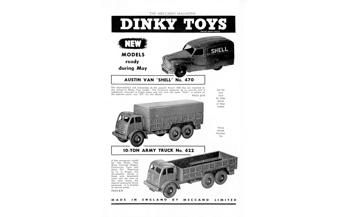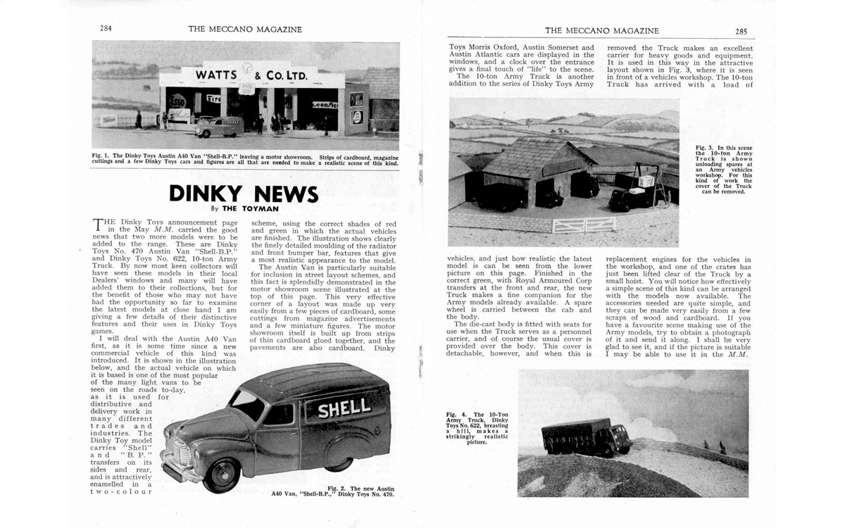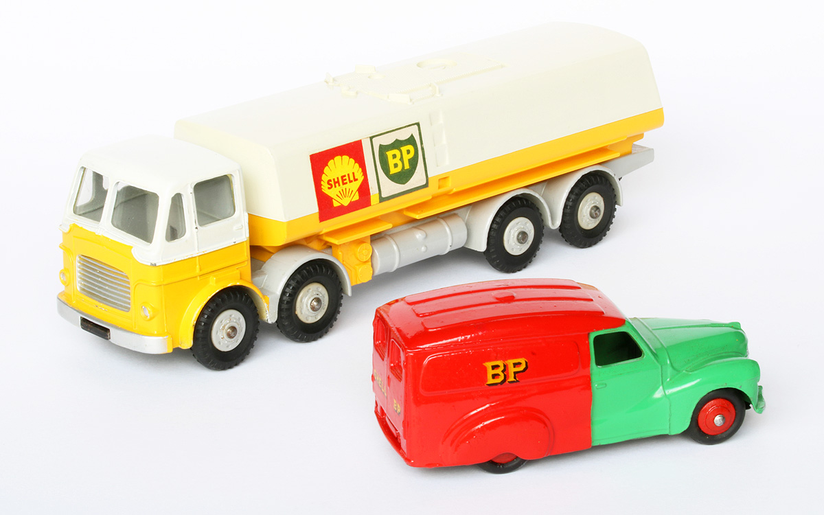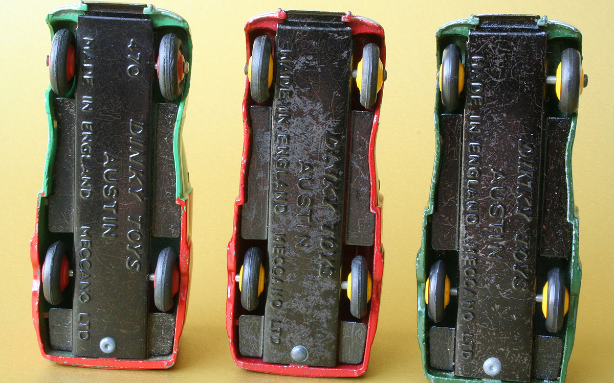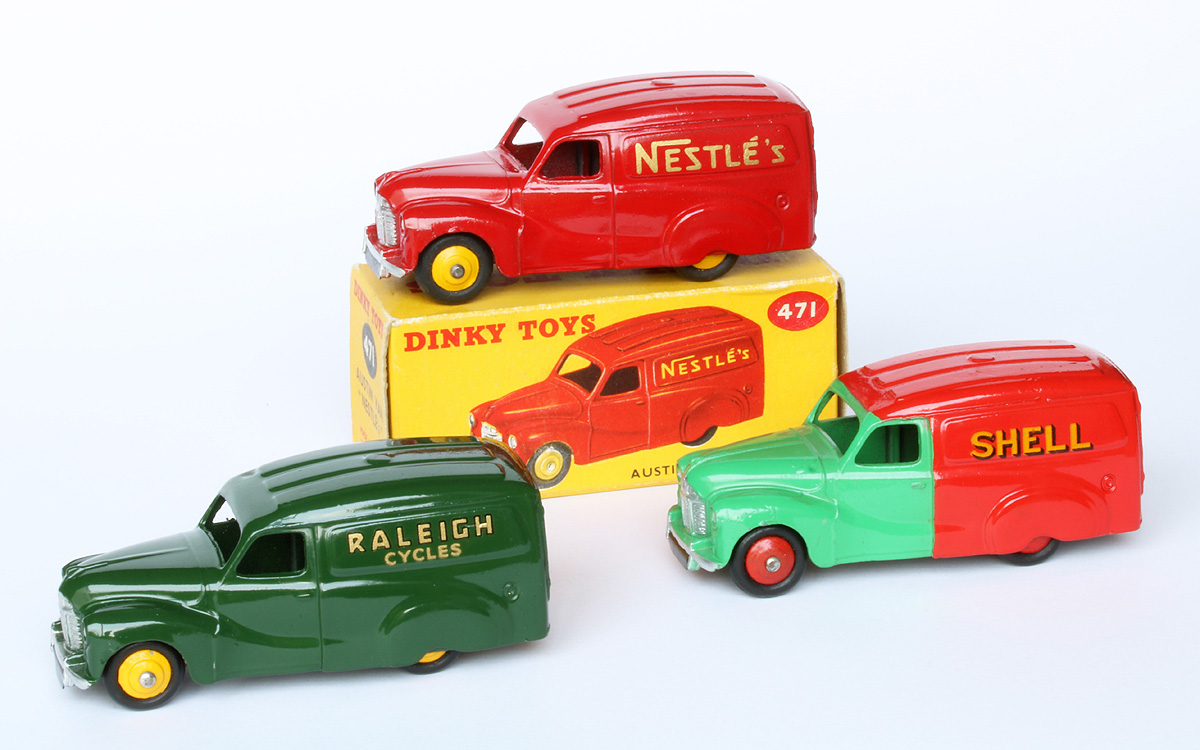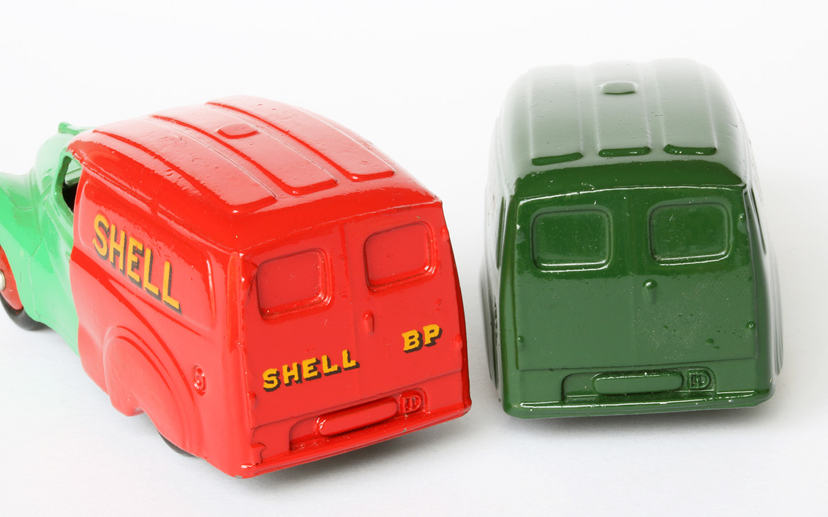 In the last few weeks I have been working hard on my annual catalogue supplement for 2017. As I needed some more pictures for that purpose my photo sessions produced some nice new photos, some of which I will use for this contribution. I expect the supplement to be complete approximately next week and possibly some printed copies at the end of next month. So, some text and photos below. This no. 470 Shell/BP version of the Austin A40 van was announced in May 1954. Meccano Magazine shows it together with the also new 10-ton Army Truck, no. 622. They are introduced and discussed in a review by The Toyman in the next months MM issue. First issued, the 'Shell/BP' was also the first one of the well-known Austin van trio to be discontinued, in 1956. There is some slight variation to the casting in the course of time. Initially, the rear wheel axle ends are practically uncovered, with the risk of the axle to escape when maltreated during rough play. That problem has been solved by adding a small 'lip' to the casting over there, now covering the axle ends. It seems that only the Shell/BP vans have the uncovered appearance and that the subsequent 'Nestles' of October 1955 and the later 'Raleigh' have the axle ends always covered by that extension. Nevertheless, it remains relatively easy to replace the rear tyres by pulling down the base plate with a screwdriver or the like. In the base plate the number 470 was embossed initially, but on introduction of the 'Nestles' Van, no. 471, the reference number was omitted, making this base plate universally applicable to all three vans. On the base plate drawing no. 13761 that number appears to have been removed on 8 November 1954 already. In fact, the Shell/BP van shows two different base plates, with a slightly different embossed lettering, which can hardly be distinguished from each other, as has been concluded by Jacques Dujardin. The first one has more round characters, the second one a flatter type. They also register slightly differently. With the first one the 'A' from Austin is on the right side of the 'N' of Dinky, with the second he is more or less straight. Both are seen with the number 470. The Shell/BP is the only one of the three in duo-tone colour. This first version is the only one that still occurs in a US catalogue of 1954 under the originally planned number 32a and under the name Austin 'Service Van'. The number 32a was abandoned on 17 June 1953, as shown in drawing of the base plate mentioned above. A trade box is not known. It must have been one of the first smaller models to have an individual illustrated end flaps box only. The oldest box did not yet bear a catalog number on the illustration sides. Later boxes do show 470 in red ovals on both sides. It is remarkable that the box bears the name Austin Van 'Shell' only, without the addition 'BP', which is used in Meccano Magazine and the catalogues. Since the Shell/BP van was not in production after 1956 anymore, it will never be found with treaded tyres. In the course of time, the rebates of the rear door window couple may differ, the second change in the casting. In the end, they seem to have completely disappeared at the Raleigh Van, no. 472, possibly as a result of repaired wear of the mould. In 1963 a second Shell/BP vehicle was introduced, the big Shell-BP Fuel Tanker, no. 944. For this model a new tank unit, made of plastic, was mounted on the cab-chassis combination of the Leyland Octopus that was in use since 1956. Additions and corrections welcome.