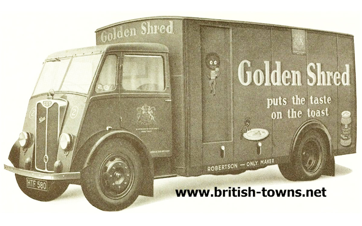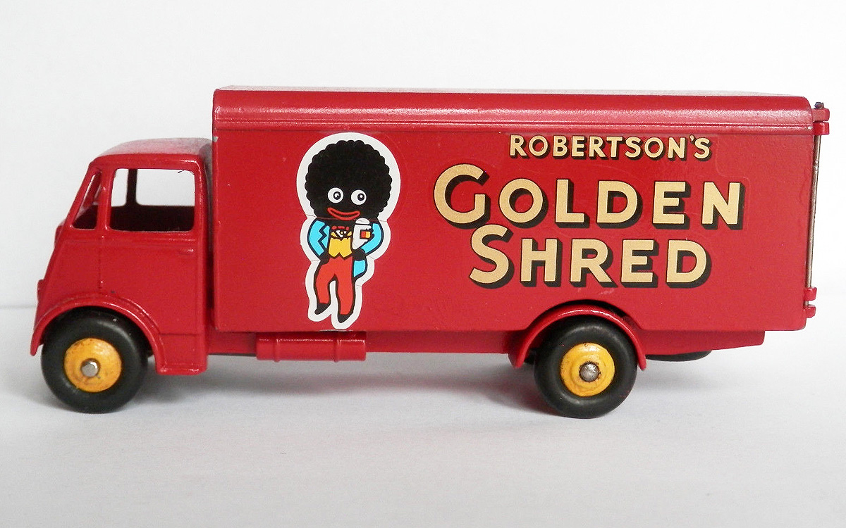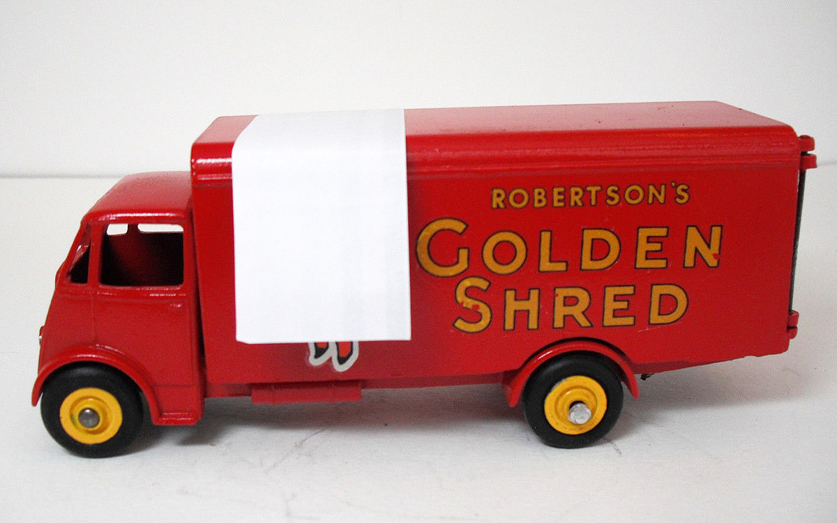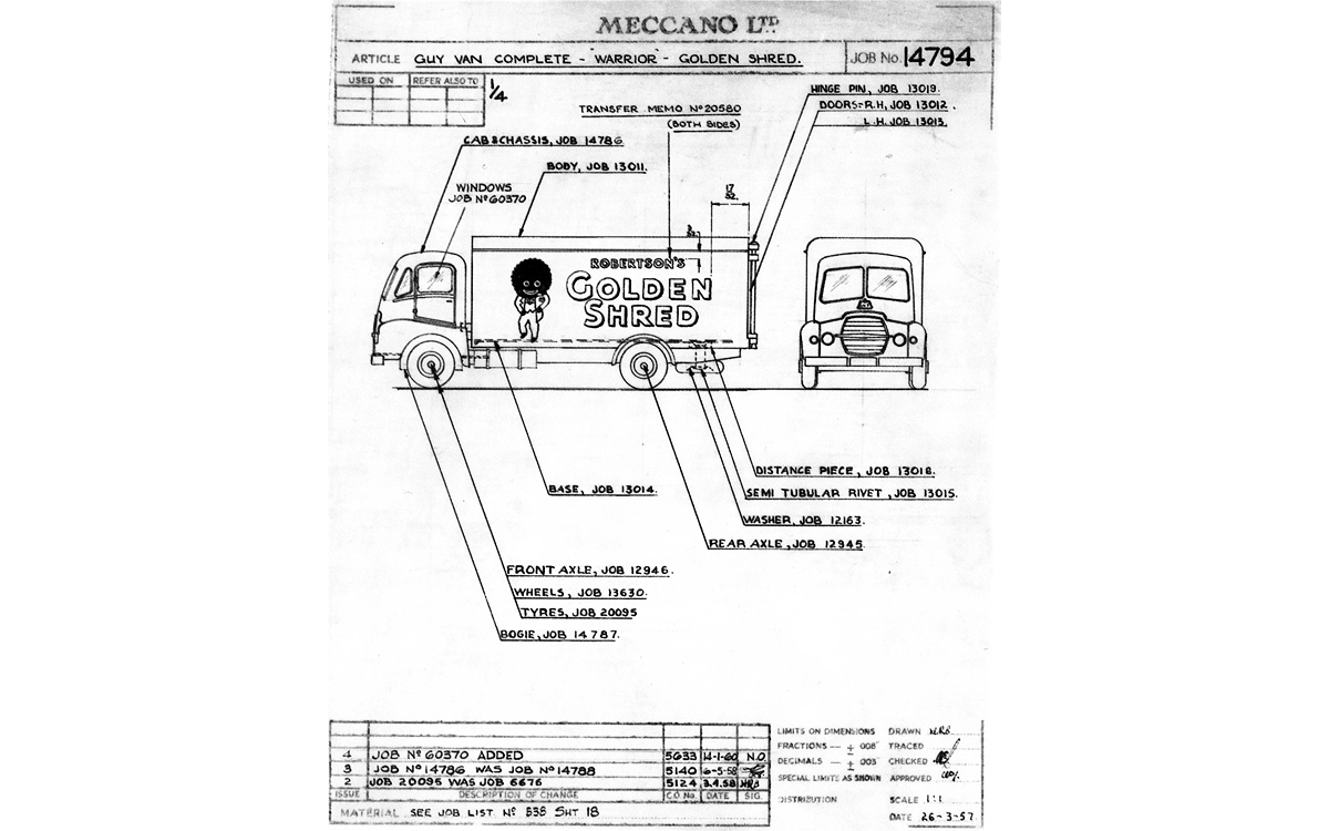 The final version of the Guy vans was issued in June 1957 in 'Golden Shred' livery, Robertsons famous marmalade product, with the logo in the form of a black doll, the then very popular 'Golliwog'. The late 'Golden Shred' is the only one of the six vans that was exclusively equipped with the second type of cab and the only one that had the brand name Dinky Supertoys in italics on the box. Issued post-1954 the 'Golden Shred' van is one of the two (together with the 'Ever Ready') Guy vans which have only ever been allocated a modern 900 number. Both are only known as Dinky Supertoys and also only packed in the familiar blue striped lid box. However, the Golden Shred is considerably scarcer than the 'Ever Ready' van, that was included in the catalogs from 1955 to 1958. Despite its availability in the years 1957-1958 we will never find the 'Golden Shred' with threaded tyres, which were introduced in the course of 1957. These are only and exclusively found on the various Guy Warrior models. After all, these were issued one year later, in 1958. The 'Golden Shred' van was introduced on the threshold of the transition from Guy Vixen to Guy Warrior models. An assembly drawing of this livery with Guy Warrior cab is therefore the only one known of this Golden Shredversion. A nice image of it was in Classic Toys 2-8 from November-December 1995. A model was never issued and the only van based on a Guy Warrior chassis appeared (and quickly disappeared) in 1960, using the new transfers (with ketchup bottle) for the chronologically overlapping Big Bedford Van 'Heinz'. The factory drawings known are: Job no. 13009, Guy Van - Golden Shred (assy), dated 28-12-1956. Job no. 13010, Guy Van Plain Van, 514 side elev. (assy), dated 04-10-1948, updated until 08-04-1958, signed D.L.M. Job no. 13011, Guy 4-ton Truck Van Body (large), dated 28-01-1948. Job no. 13011, Guy Van Body (large), dated 28-01-1948 (01-04-1957 redrawn). Job no. 13012/3, Doors - Guy Van (small), dated 09-02-1948. Job no. 13014, Base - Guy Van (small), dated 08-04-1948. Job no. 13016, Distance Piece Guy Van (small), dated 08-04-1948. Also: Job no. 14794, Guy Warrior From 'Golden Shred' (assy), dated March 26, 1957 (not issued). Picture of job no. 13009 Golden Shred complete drawing: Christies 9/1995 p. 15 Picture of the (general) no. 13010 complete drawing: Christie's 9/1995 p. 15. Picture of job no. 14794 (Guy Warrior 'Golden Shred') Classic Toys 2-8 p. 55. Pictures (full size) of van body etc on this website: Publications > Documents > Factory Drawings (registered users only). (Sources: Christie's 9/1995 nos. 140, 141, 148, Classic Toys 2-8 1995 p. 55, 59, Richardson GBofDT p. 196, 208).Robertson's Golden Shred brand of marmalade and fruit preserves was created in 1864 by James Robertson (1832-1914). The couple Robertson-McFadyen invented the recipe where the bitter taste of the orange could be reduced, while their marmalade retained the 'highly tonic value of the fruit'. The origin of the Golliwog as a logo is described by wikipedia as follows: 'Just before World War I, John Robertson (son of James Robertson) was on a tour of the United States. Whilst on a visit to the backwoods he noticed many young children playing with little black rag dolls with white eyes, made from their mothers' discarded black skirts and white blouses. Intrigued by the popularity of the Golly (the name being the children's interpretation of doll), he thought it would make an ideal mascot and trade mark for the Robertson's range of products. Accepted by the company, Golly was first shown on Robertson literature in 1910, on items such as labels and price lists'. The image of the doll has become the subject of controversy nowadays. Under the influence of social changes in the past few decades the use of the Golliwog figure came under attack. Whereas especially in the United Kingdom the Golliwog had become (and still is) a very popular collector's item in all sorts of forms, Robertson's discontinuation of this well-known trade mark took place in 2002. It has since been replaced by the Paddington Bear, which was not questioned. Because of these developments, this beautiful and popular last Guy Vixen van, unintentionally and very regrettably, seems to have become a sort of 'guilty' Dinky Toy as more than once, on eBay and on other internet sites, we suddenly find a Golden Shred model of which the Golliwog logo is hidden from view nowadays.