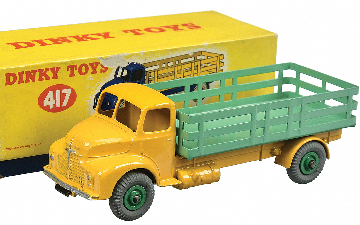 As I found a common but very nice dark blue / (ocre) yellow example of the Leyland Comet Lorry recently, I had a good reason to revise and extend my existing, almost twenty-year-old catalogue text for this model. A translated and edited version of this catalogue essay here, hopefully contributing to some activity on the forum. This text is provisional, so any comments, additions and corrections, be it in text or in pictures, are very welcome! Surrounded by a series of new garden and agricultural implements a New Style Lorry was introduced in the July 1949 issue of Meccano Magazine: the no. 531 Leyland Comet Lorry. It is a representative of an entirely new range of medium weight diesel-engined export models, to be made available in limited numbers at home, it was explained in the magazine article. Compared with the regular Dinky Toys the Leyland Comet Lorry was a robust large scale model, a new addition to the existing Fodens and Guys ranges, heavy 1/48 scale trucks, all of them. The application of so much tinplate to the Lorry structure was something unprecedented. Half a year later, the Coles Mobile Crane would also be equipped with a substantial, essential tinplate component part (the jib). The tinplate rear bed with fence is of solid, sturdy quality, as we see it rarely damaged or bent on play-worn examples. The model was developed in the course of 1948. The 'complete' drawing, job. No. 13120 of August 26 1948, signed by D.L.M., was auctioned at Christie's South Kensington in September 1995. Nevertheless, it is not listed in the Great Book of Dinky Toys. The details shown provide interesting information, all parts, their job numbers and descriptions of changes to the model are included. The other individual designs, for the chassis (13121), the bottom (13122), the loading floor (13124) and the clip for the loading platform (13126) are listed indeed by the Richardsons, on page 196. With a little imagination, this vehicle can also be counted among the farm and garden attributes. In 1950 it got a small-scale and therefore cheaper counterpart, the Dodge Farm Produce Wagon, No. 30n, and its predecessor was the pre-war no. 25f Market Gardeners Wagon. The Lorry was the first in a rather small series of three Leyland Comet models. Still, it would take almost another three years before it was joined by the remaining two companions, the no. 532 Leyland Comet with Hinged Tailboard the no. 533 Leyland Cement Wagon. Of this trio only the Lorry was equipped with a - usually unpainted - towing hook. Red Lorries with a yellow stake body plus wheels are the oldest but certainly not the rarest. They always have ridged Dinky Toys hubs (and the related thinner type of axles), which were common until about 1952. Partly simultaneous with that version was also a scarcer mid-blue version with a light brown body. This one may show up either with ridged (early) or the subsequent grooved hubs. The latter can also have red hubs. Equally harder to find is the later yellow version with a green stake body and wheels, which only appears with the final reference number 417, and was always packed in the later yellow lid box. Merely two colours were advertised in the catalogues. The dark blue/yellow one with red wheels from 1952 to 1956, and the yellow/green version in 1957 and 1958. The dark blue/yellow model bore all three catalogue numbers and is comparably common as the early red/yellow model. Until 1952 the catalogue and MM images were in black and white only, so the first one issued, in red and yellow, or the mid-blue one will never be found in colour print. The later dark blue/yellow model is found with light blue wheels, as no. 417 only. An overview of variants was compiled over twenty years ago by Stewart Orr & Graham Bridges in Classic Toys (Vol 2, issue 9, page 6), but in the meantime more colours and subtle variations have been distinguished. Besides, we will have to be aware of the possibility to create non-existing combinations based on early models of which the chassis and the loading platform are connected with a screw and nut instead of the later unbreakable rivet. Rarely noted is the difference in width of the silver-coloured finish of the front bumper. Until about 1954 this silver strip is considerably narrower, thinner than after that. This also applies to no. 532, the Leyland Comet with Hinged Tailboard and no. 533, Leyland Cement Wagon. The towing hook was probably of the small type only before 1952, then large. Boxes were blue with a red or orange base printed b/w label (Dinky Supertoys, 1949-1952), blue with orange base printed label (Dinky Toys, 1952-1954), blue with blue striped lid (Dinky Toys, 1954-1956) and finally all yellow (Dinky Toys, 1956-1959). After Leyland Motors had ceased its war production (including the Comet tank), the development of the - partly export-oriented semi-forward control Comet truck in 1946 was an important new activity. In the United Kingdom they found employment on a large scale, not only as a lorry but also as a bus and as a tractor for trailers. 'Comet' refers to the chassis type and not necessarily to the cabin that was so characteristic at the time, which is somewhat reminiscent of that of the Dodge. Kind regards, Jan