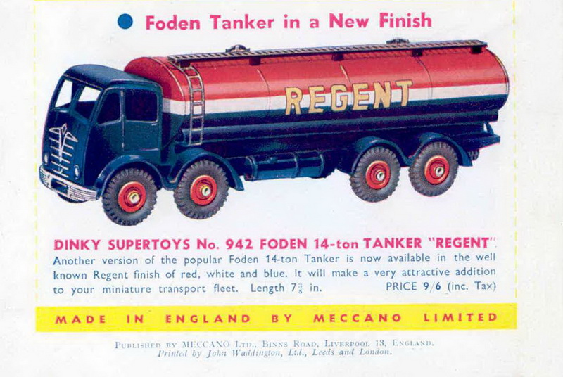 Note: First appearance of the 942 Foden tanker Regent in UK catalogue 1955 with the never issued red filler caps. The 942 was only issued with black filler caps. Only the 1st issue of the 504 Foden tanker Mobilgas was for a very short time (1953-54) issued with red filler caps. Filler caps from tankers without advertising always got the colour of the tank body.