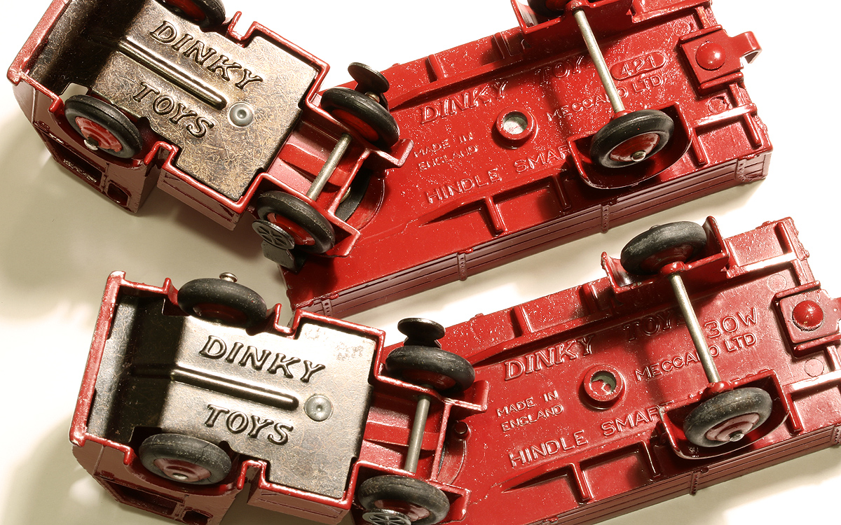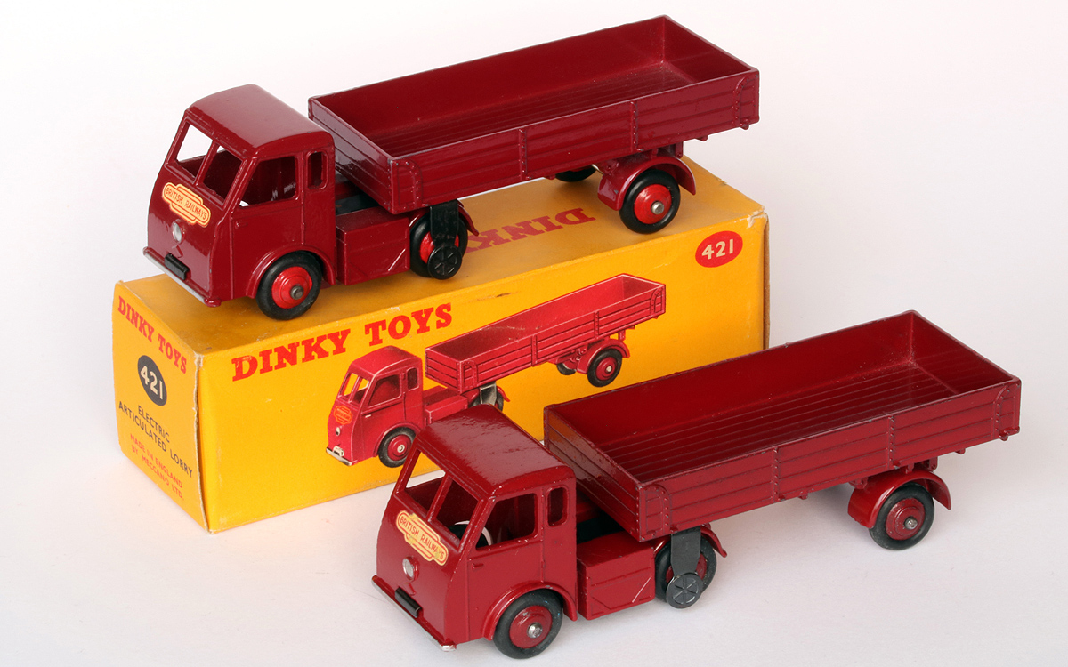 Two pictures below of the Hindle-Smart Electric Articulated Lorry, both the unboxed no. 30w, a trade box model, all maroon, until 1954, and the subsequent individually boxed no. 421 in maroon with red hubs. The cast in number 30w was changed too by deepening the die over there, resulting in an oval in relief showing 421. Thirteen years ago there was a discussion on the talk model toys forum, which I will not copy here but just refer to: www.talkmodeltoys.com/discus/messages/27...1190.html?1345308081
