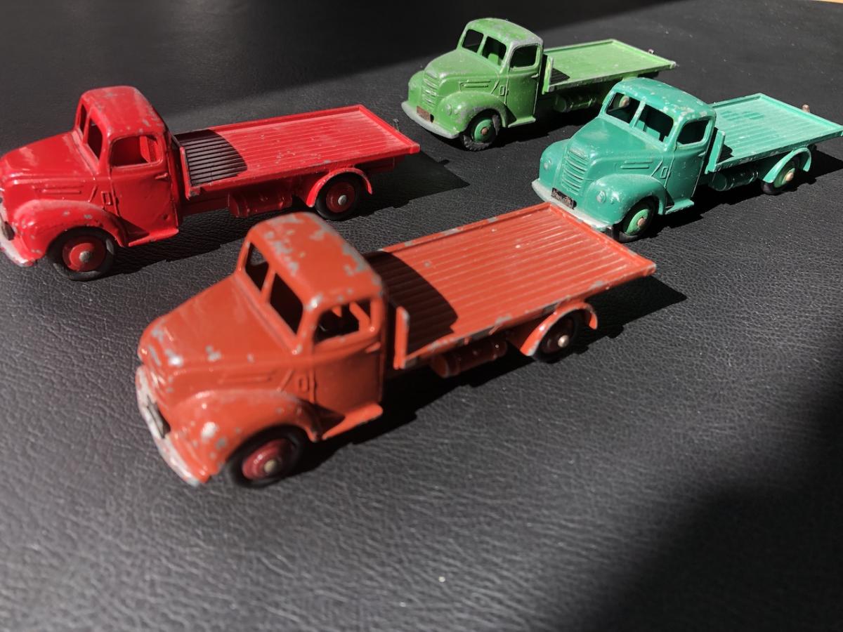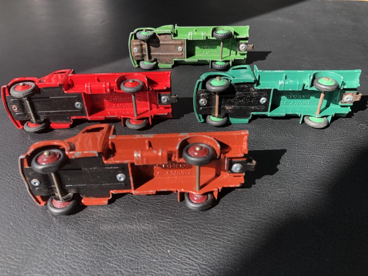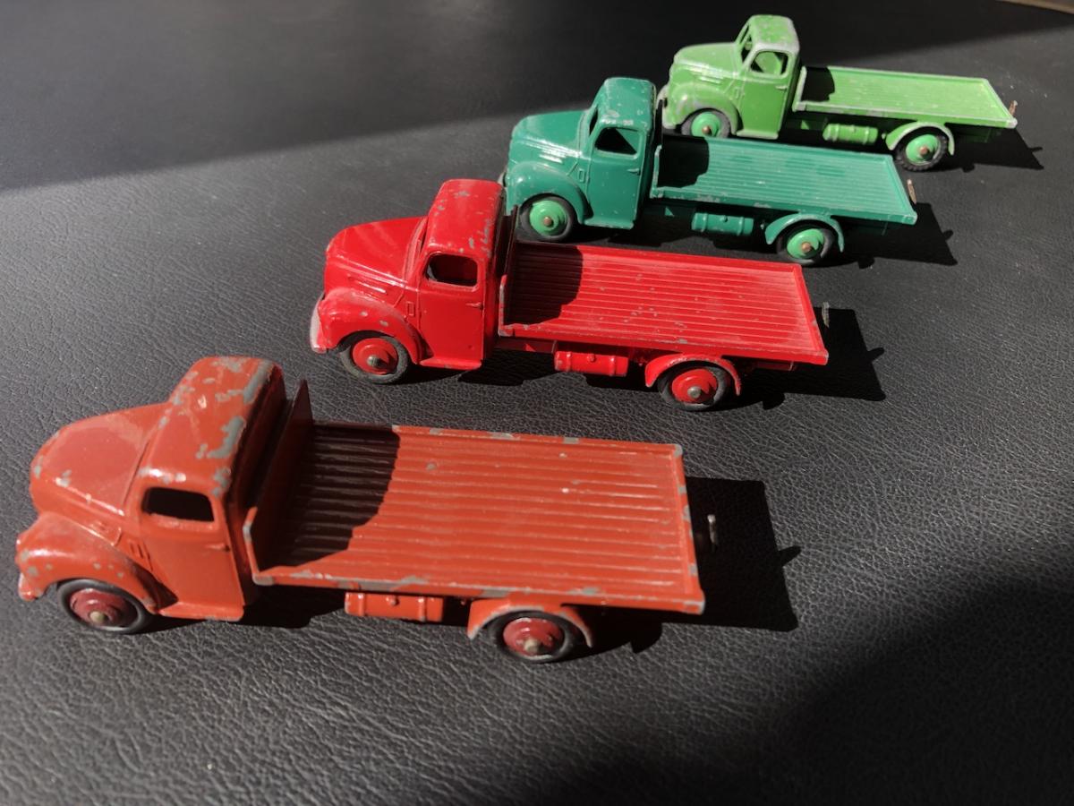 I couldn't find this topic, so let's kick off: Here are my four Fordson Thames flat trucks. Made between 1951 and 1960. First sold from a tradebox as 30r and later individually boxed and marked 422. The later versions have the marking 422 and come with a rear cross member behind the rear axle as an extra strenghtening. The difference in green can clearly be seen with the dark one being the oldest. The brown one with maroon hubs is the rare version.