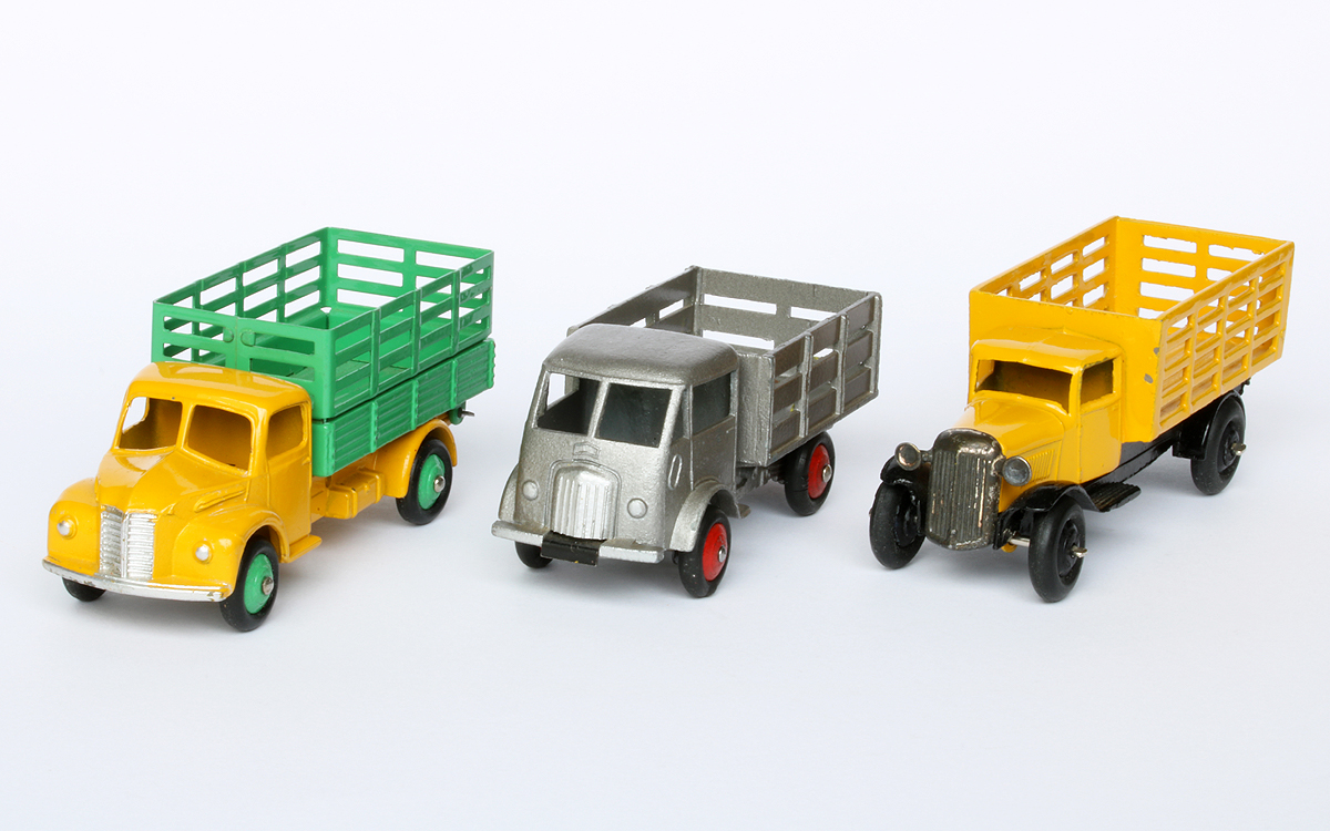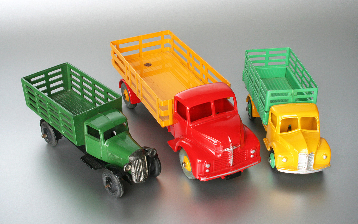 The Market Gardener's Van, also called Wagon, closes the line of the basic pre-war 25 Series. It can be found with any of all four types of grille/chassis combinations in the period 1934-1950. Post-war it was finished in the colours yellow, green, orange and grey, with a black chassis. Pre-war there were more colours available. The Market Gardeners Van was succeeded by the (Dodge) Farm Produce Wagon (no. 30n) in 1950. The former has a moulded diecast fence, the latter has a tin fence fitted, which is clipped onto the diecast back. On a larger scale the Leyland Comet Wagon, a Dinky Supertoy (no. 531) of 1949 shows some similarity. Experiments were carried out on some occasion with a cast fence. Before the Fodens started their advance as Dinky Supertoys in 1947, a smaller-scale prototype of this eight-wheeled truck was made, equipped with a loading platform, but apparently the option of a fence unit was also studied (see fig. 423 in DT&MM p. 248). The French produced the related Plate-forme ridelles, no. 25f, their own market gardeners model, based on the same principle and with approximately the same time-span of availability. Their Ford Betaillre (no. 25a) and (Studebaker) Camionnette Maraicher (no. 25k), in their turn, were the contemporary 1950s counterparts of the (Dodge) Farm Produce Wagon, although their fencing was still fully diecast. Some pictures below. Additions, correction etc. welcome, kind regards, Jan