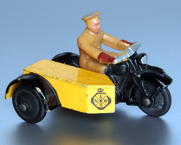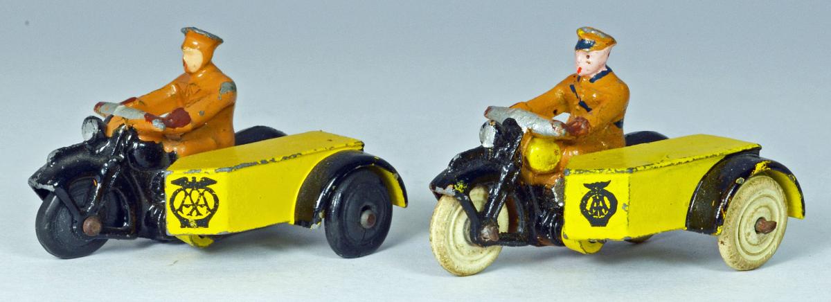 Dave--You are quite right about the various motorcycles that Dinky produced over the years. I have always had a fondness for them, that started with my very first 5 Dinky Toys that I got as a young boy: one was the Police Motorcycle Patrol, and another was the AA Motorcycle Patrol. Those tiny motorcycles, with their very cute sidecars, were always a favorite of mine. You had some nice pictures of the post war versions, and you alluded to the changes that Meccano made in regards to paint detailing. Like most of their models, it was necessary after the war to reduce the hand work involved in painting the minute details on both the motorcycles as well as the various figures in many of the sets. I am posting some pictures that will show just how much was changed. Generally, the pre-war motorcycles had silver painted cylinder heads plus silver painted exhaust and mufflers, and of course, white tires. On the AA Motorcycle Patrol, the gas tank in the pre-war version was also painted yellow, to match the sidecar. In addition, the motorcycle riders pre-war were also detailed. Their hats sport black brims, their faces are painted in with eyes and mouths, chin straps for hats or helmuts, buttons on outerwear, etc. The detail is astounding when you look closely and then realize how much time must have been involved using very tiny brushes. Enjoy!!Terry