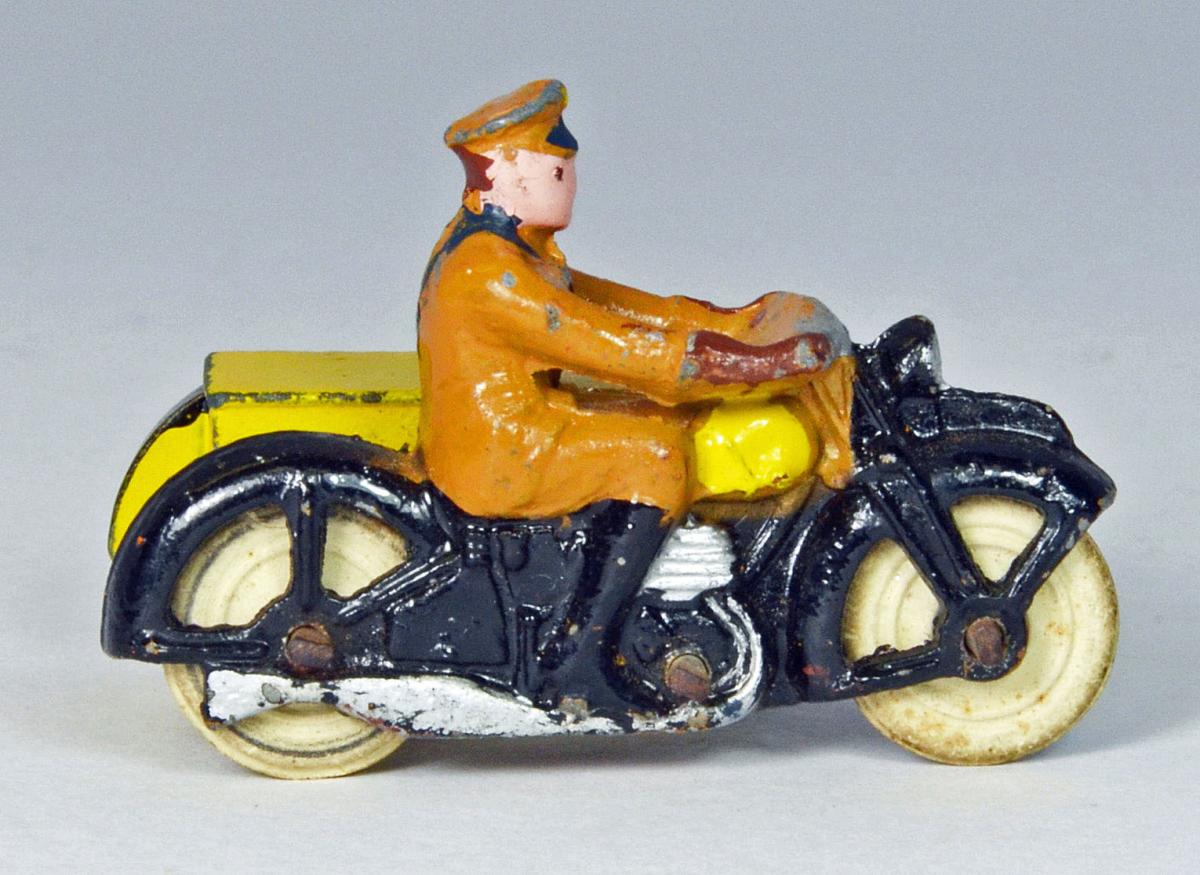The 44b AA Motorcycle Patrol has an interesting history. First introduced in 1935, as part of the #44 AA Hut, Motor Cycle Patrol and Guides set, the motorcycle, like the others, was discontinued around 1940, then re-introduced after the war once again. In 1954, in the US catalog, it has been re-numbered to 045, and also appears in the US 1955 catalog, then it is discontinued until 1959, when it reappears, now numbered 270. It then remains in production until 1962, when it is finally retired. I have never heard of a Dinky Toy discontinued, then re-introduced a few year later.....has anyone else? For these last years of production, it was fitted with small grey, Dublo style tires, some smooth, some treaded. I do not have the later version, which has different tires, etc., so someone else is welcome to post photos of it. As with the Police Patrol and the RAC Patrol Motorcycles, there are the usual pre-war differences....white tires, extra hand painted details, and also a different size and style of AA sign or logo on the front of the side car. Best regards, Terry