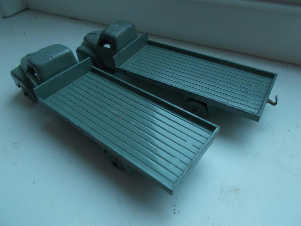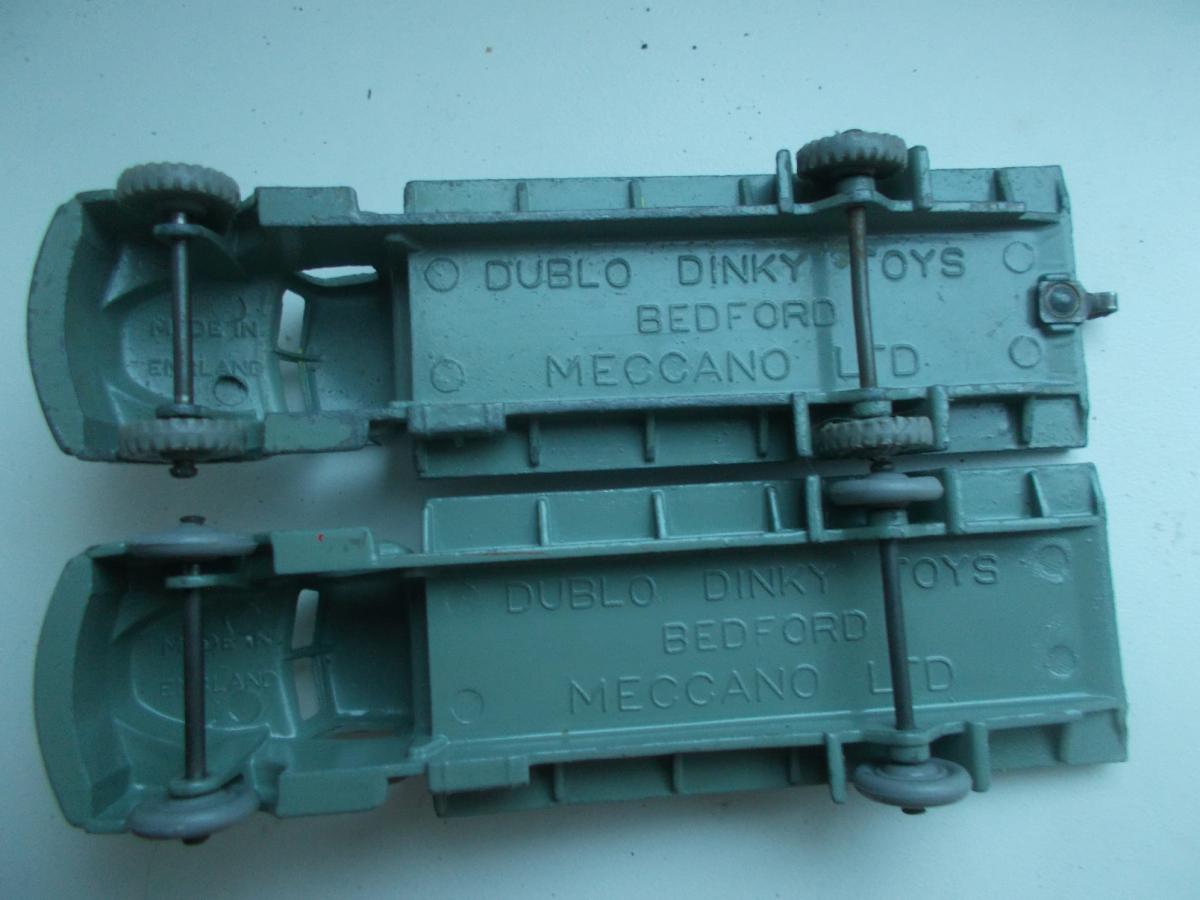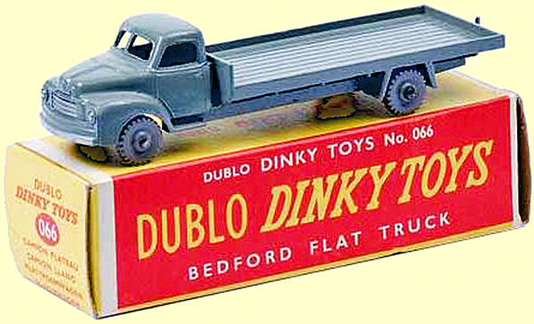 I recently acquired an example of the scarce version of the Bedford Flat Truck with towing hook. Not in pristine condition, but certainly acceptable, and the first one I've seen. The towing hook was obviously a late addition (note the treaded wheels), but I assume that there would have been an intention to produce a trailer of some kind to make the addition worthwhile - unless it was the plan to use a Dinky Toy 429. There were two trailers in the Dublo range at the time, but the trailer for the Lansing Bagnall tractor was obviously too small for a lorry of this size, and the Horse Box trailer does not couple happily with this truck. Is there any evidence of when the hook was added, and have any examples been seen with smooth grey, or treaded black, wheels?