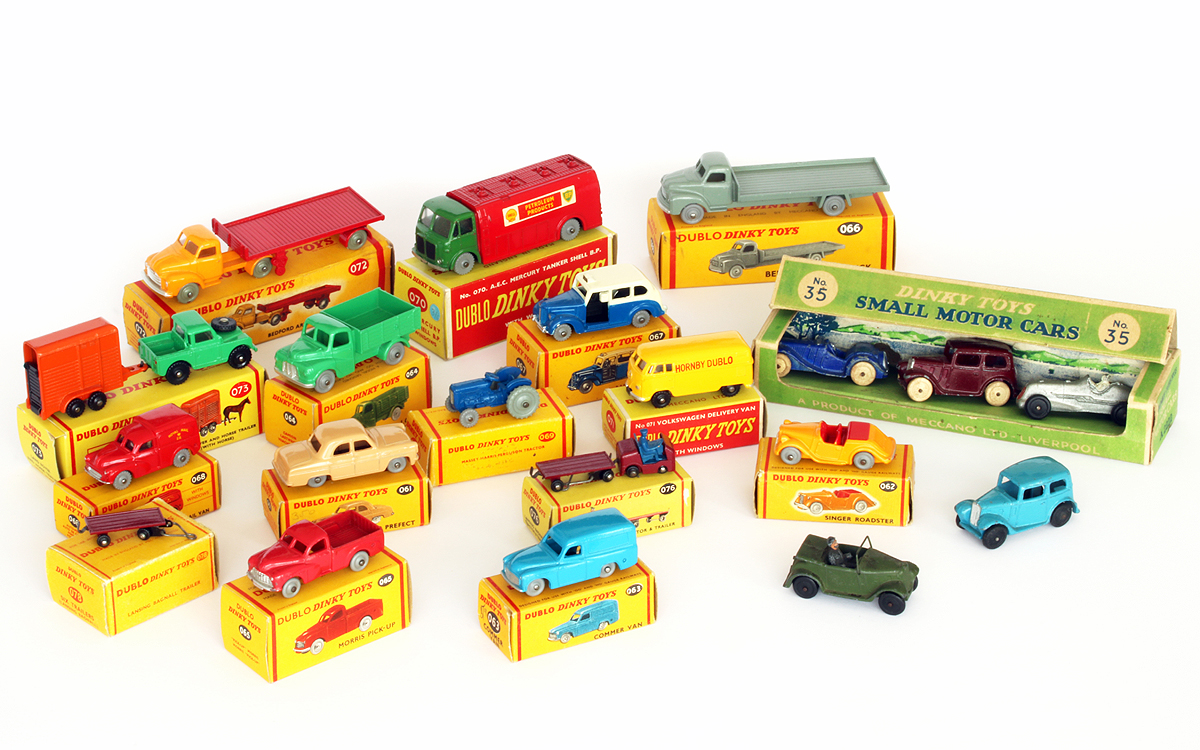 All Dublo Dinky Toys, variants excluded, 35 series included (Rob van der Hoort and Ilone Rijsbergen Collection). Article in Auto in Miniatuur 2021:4, p. 38-39.