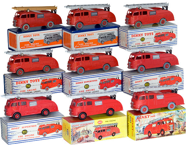 In the past year or so I managed to add two more variants to the nine predecessors, bringing the number at eleven. Variations may occur both as the boxes and the models themselves are concerned. I hope you appreciate the listing below, showing these variants (the American visipac still wanting). 555/955 FIRE ENGINE WITH EXTENDING LADDER (my variants) Year: 1952 Ladder: brown Plastic windows: no Reels: medium grey Rear control panel: red-silver Hubs: diecast Tyres: grey radial tread Base plate: brunofix, Dinky Toys 555 Box type 1 (blue, black/orange printed label) Year: 1953 Ladder: silver Plastic windows: no Reels: medium grey Rear control panel: red-silver Hubs: diecast Tyres: grey radial tread Base plate: brunofix, Dinky Toys 555 Box type 1 (blue, black/orange printed label) Years: 1953-54 Ladder: silver Plastic windows: no Reels: medium grey Rear control panel: red-silver Hubs: diecast Tyres: grey radial tread Base plate: brunofix, Dinky Toys 555 Box type 2.1 (Striped, DINKY TOYS 555)