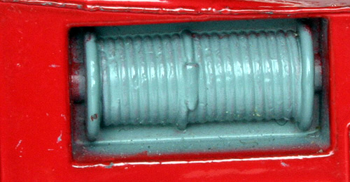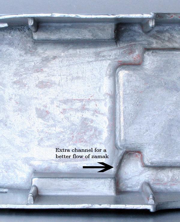 Closer inspection shows an asymmetrical flow channel, undoubtedly added in the course of production, between 1952 and 1955, in order to ease a better penetration of the fluid zamak into that area of the die only, the right hose reel box. This means that contrary to the left reel hose box there was a problem from the inside of the die here. The left one will have had problems with the outside part of the die. My curiosity into what more may have happened with the die, possibly showing more of such adaptations and cast flow improvements on the inside in the course of time, cannot persuade me to break up some of my other fine Fire Engine models. So my question is if owners of open castings of this model could inspect their examples please, in order to see if other remarkable observations can be done in this respect. Thank you in advance!Kind regards, Jan Werner