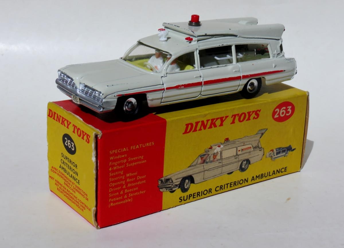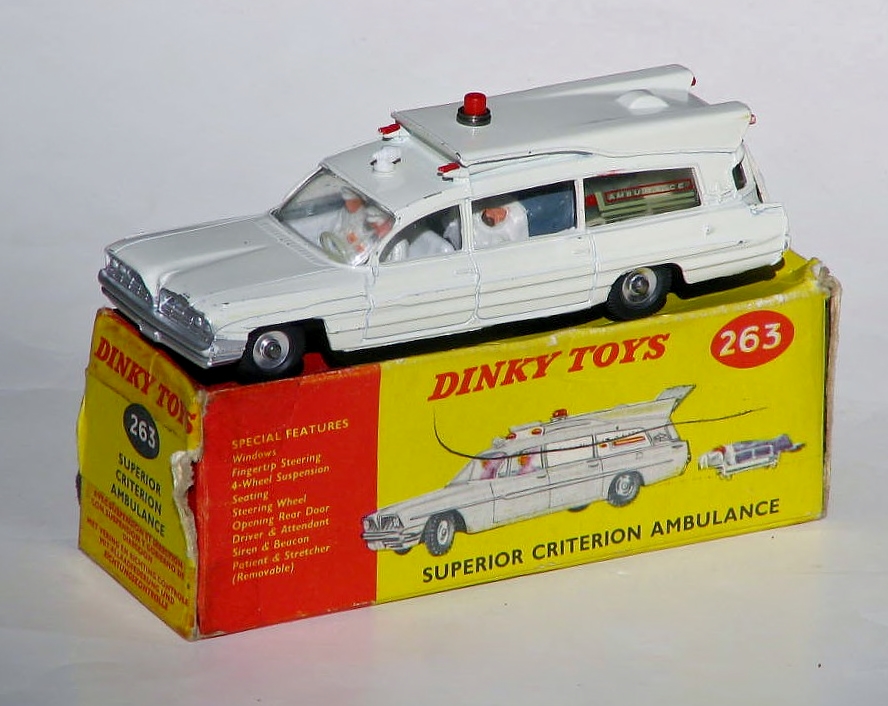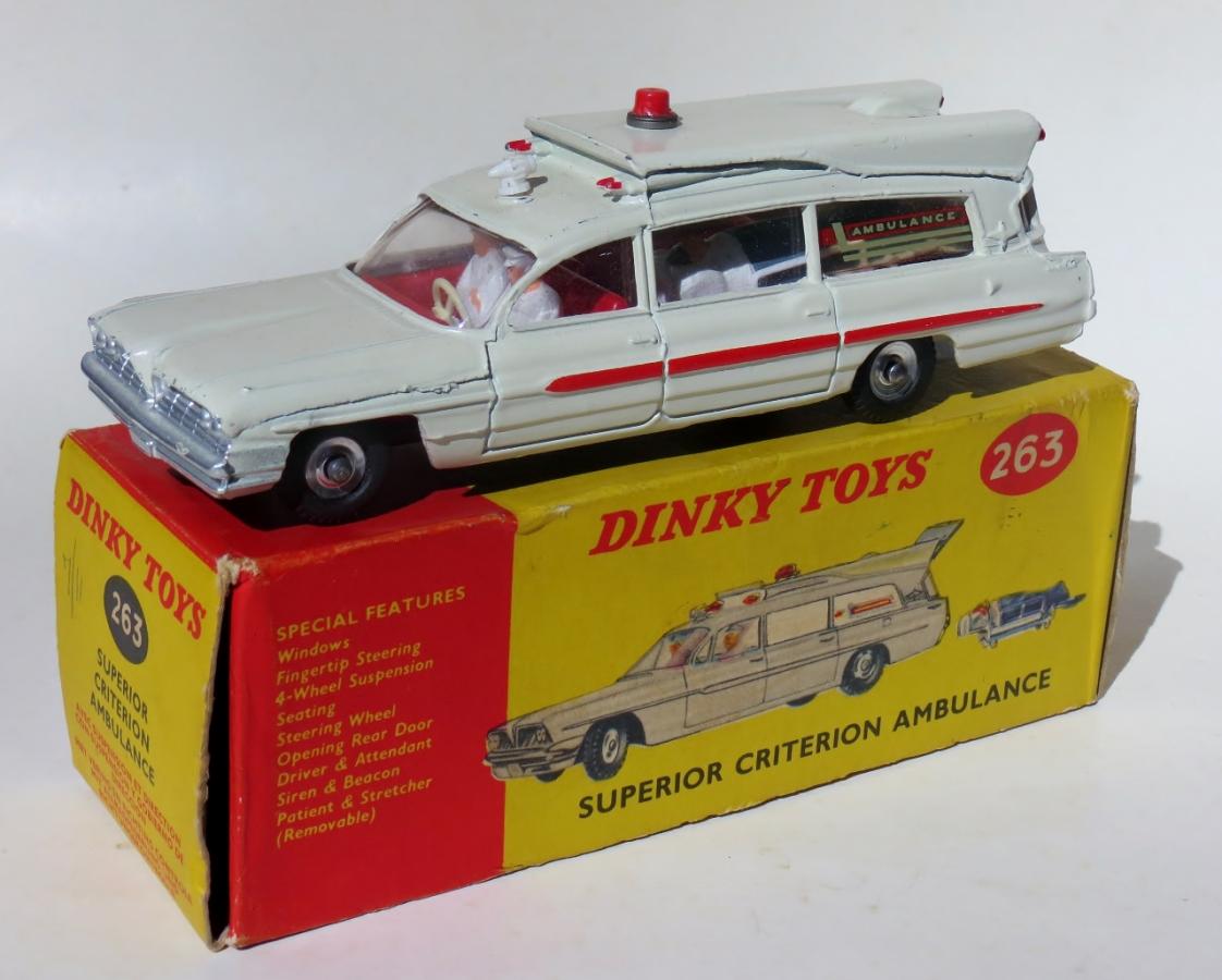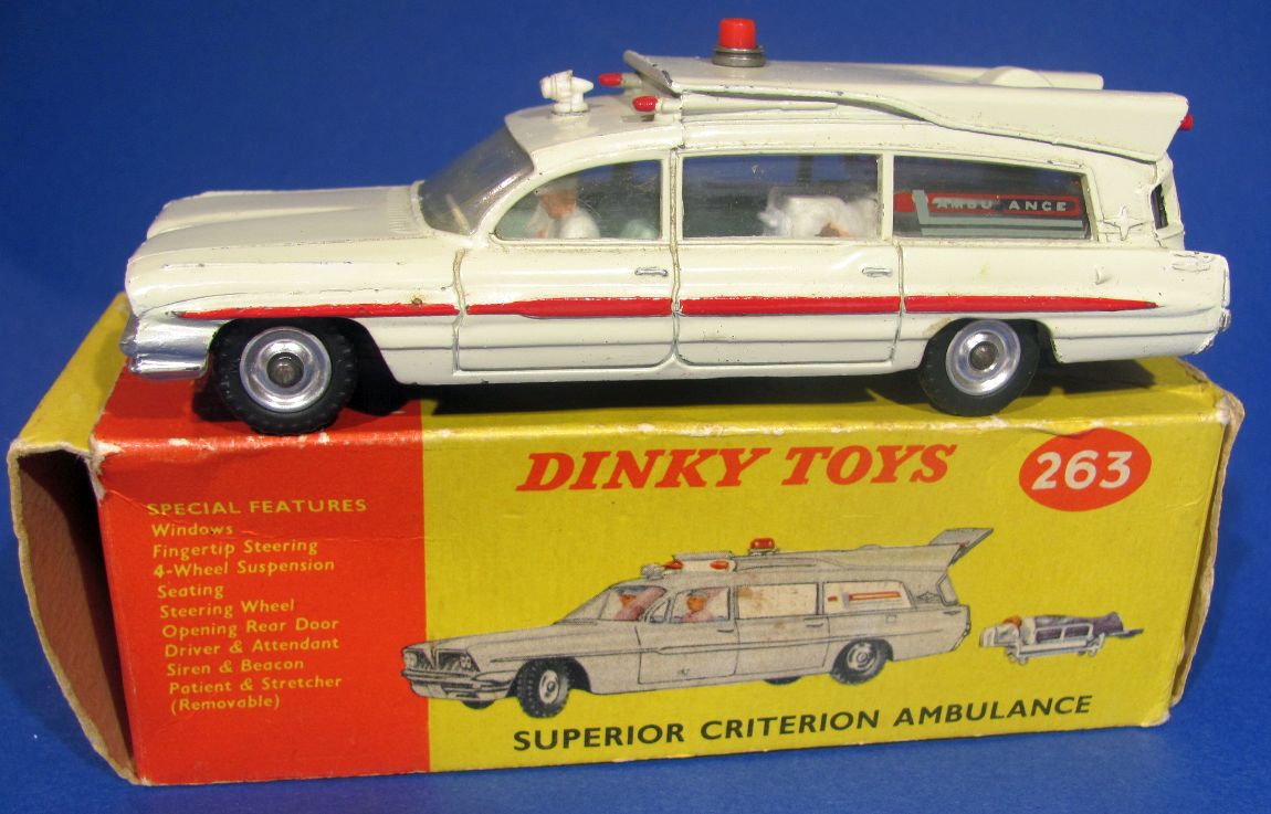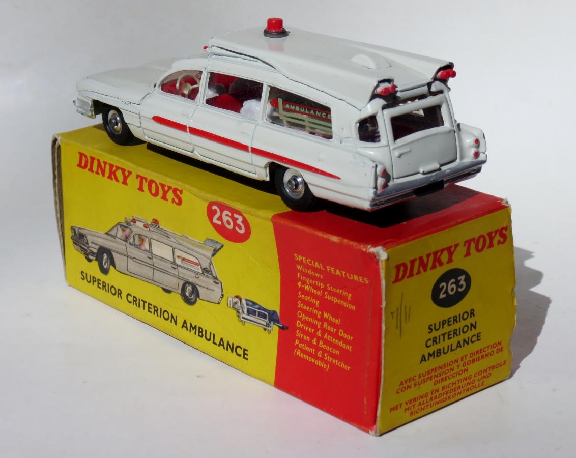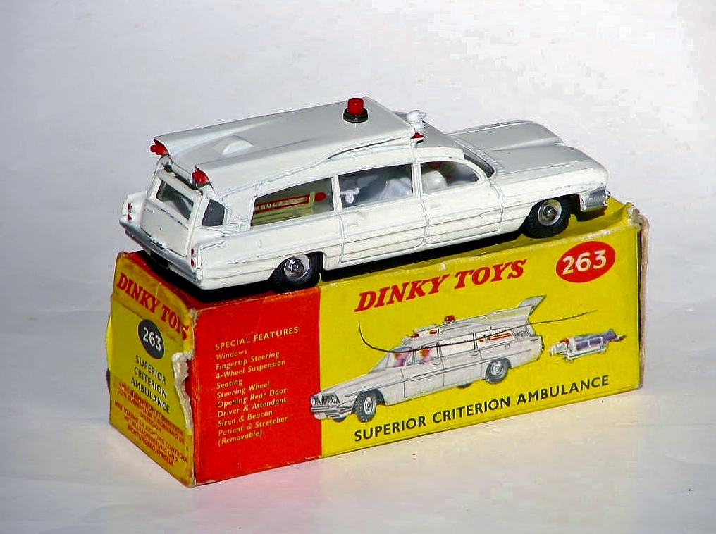 Hi Bruce and all, I have just received a Dinky 263 Superior Criterion Ambulance with box. It is pretty standard with pale blue interior, except it has standard sized spun hubs instead of the smaller ones. I have a red interior one already but someone has evacuated all the personel - no driver, assistant or patient! Also a 'standard' one with pale blue interior and small hubs and am on the trail of a yellow interior job. Ron F