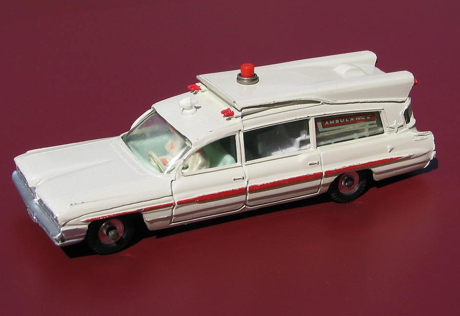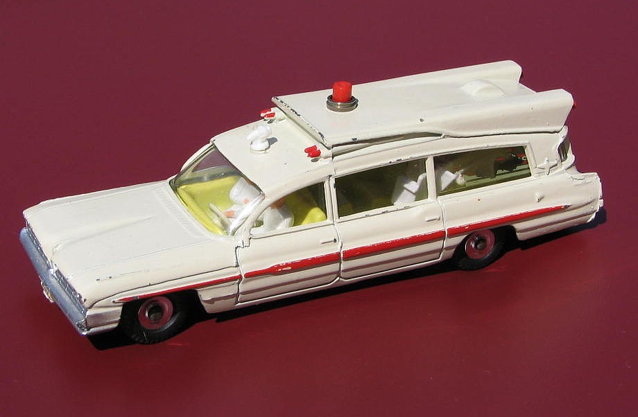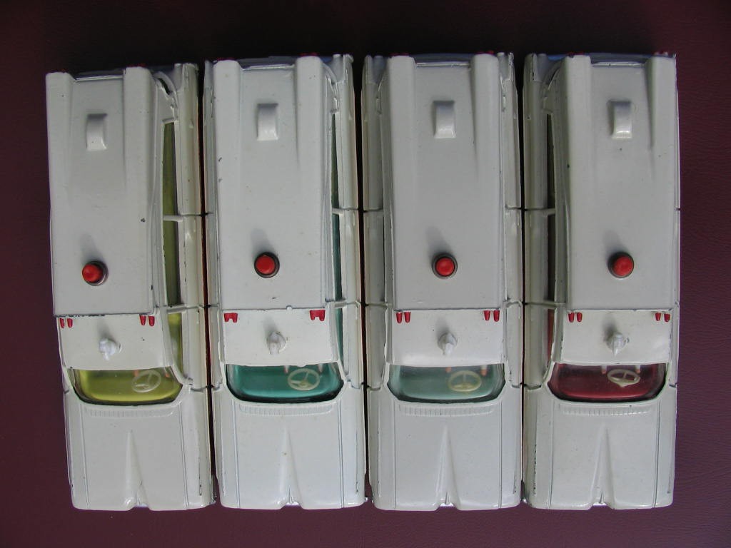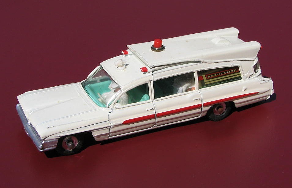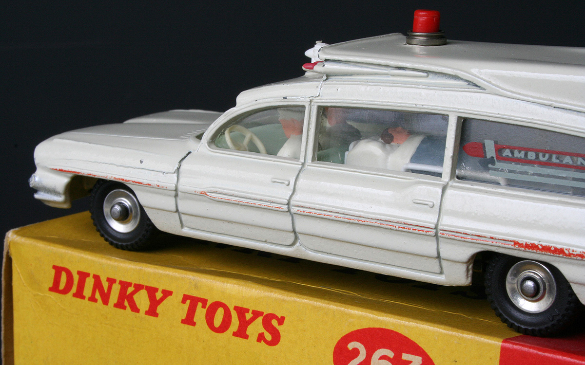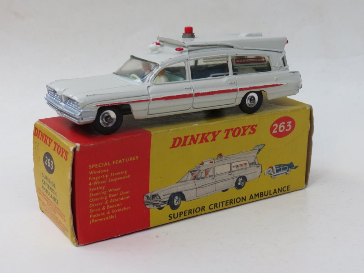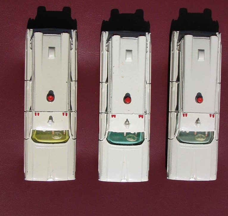 Hi Bruce and all, I have just received a Dinky 263 Superior Criterion Ambulance with box. It is pretty standard with pale blue interior, except it has standard sized spun hubs instead of the smaller ones. I have a red interior one already but someone has evacuated all the personel - no driver, assistant or patient! Also a 'standard' one with pale blue interior and small hubs and am on the trail of a yellow interior job. Ron F