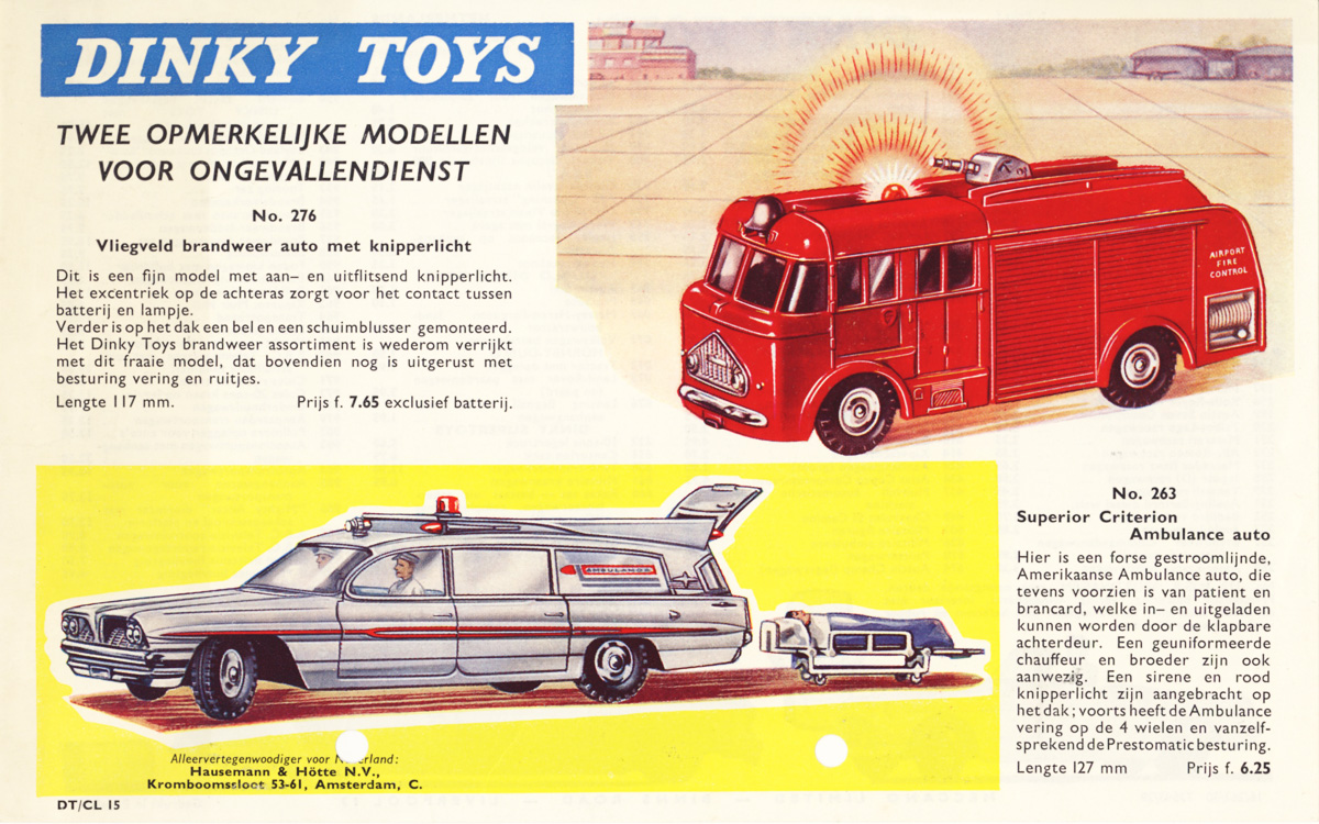 Browsing through my image files I came across some older photos of the no. 263 Superior Criterion Ambulance, an over 50 years old Sint Nicolaas present. From a former colleague I got his ambulance some years ago, which was so well played-with, that it was virtually only suitable for satisfying my curiosity to the inside construction of this Dinky Toy. Although this model is beyond my present collecting time slot, the Superior Criterion has always remained one of my firm favourites, with all the (incidentally very successful) features, the realistic recessed contours for the doors, the sheer impressive uncommon design etc. I remembervividly when having completed my home work I tended to make a little bicycle tour along some toy shop windows in Haarlem (NL), one of them having it newly on display. Altogether I must have been staring there for a very long time. I got it as a present at last, in December. Although we played with it often and intensively, the condition of both the model and its box is very reasonable still. Added finally a nice Hausemann & Htte flyer in Dutch, advertising the ambulance in a spectacular way. Just a little type-set error below left: Alleervertegenwoodiger(exclusive agent) should read: Alleenvertegenwoordiger. Kind regards, Jan